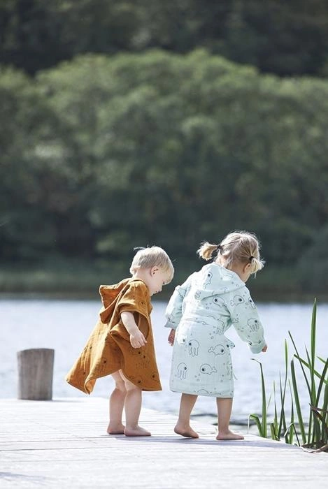 Muślinowy, mięciutki szlafrok dla dziecka z kolekcji Sea Friends z długimi rękawami oraz kapturem. Owinąć szkraba po kąpieli w ręcznik jest niełatwym zadaniem szczególnie kilkulatka, który po kąpieli nabiera energi :) Szlafrok, to dobre rozwiązanie w domu, na basenie czy na plaży. Muślin to materiał, który z każym praniem staje się bardziej miękki. Szlafrok owinięty wstążką, doskonale sprawdzi się w roli prezentu.