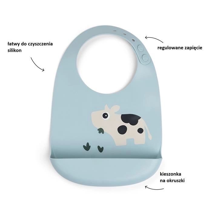 Ułatw sobie codzienne karmienie malucha dzięki praktycznemu i komfortowemu śliniakowi silikonowemu z motywem krówki Dotti. Wyposażony w funkcjonalną kieszonkę, która skutecznie łapie spadające jedzenie, pomaga utrzymać porządek przy stole i ogranicza bałagan.