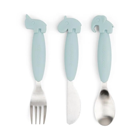 Zestaw sztućców Deer friends Easy-grip z łyżką, widelcem i nożem zapewnia pewny chwyt i pomaga skoncentrować się na zadaniu. Posiadanie sztućców dopasowanych do małych rączek jest niezwykle pomocne w nauce samodzielnego jedzenia. Urocze sztućce mają miękkie silikonowe antypoślizgowe uchwyty dzięki czemu staną się ulubionym zestawem twojego dziecka. Nóż Ozzo, widelec Nozo i łyżka Elphee pasują do całej kolekcji zastawy stołowej Done by Deer.