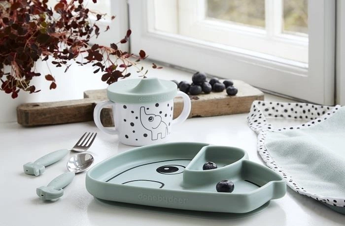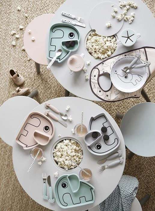 Elphee jest gotowy do posiłku! Talerzyk silikonowy „Stick & Stay” z dwoma praktycznymi komorami pozostanie na miejscu i pomoże Maluchom opanować umiejętność samodzielnego jedzenia. Talerzyk posiada bezpieczną podstawę z dużą przyssawką, uniemożliwi przesuwanie się talerzyka po stole. Talerzyk jest łatwy do usunięcia przez rodziców, ale trudny dla dzieci. Wystarczy podnieść do góry silikonowy uchwyt ukryty za uchem Elphee, aby podnieść talerzyk, niewidoczny dla dziecka. Przyssawka zapobiega poślizgom, przewróceniu, pchaniu lub podrzucaniu, dzięki czemu rodzic będzie miał pewność, że jedzenie nie wyląduje na stole. Zaokrąglone wewnętrzne krawędzie zostały tak zaprojektowane, aby ułatwić dziecku samodzielne nabieranie jedzenia. Talerzyk w kształcie słonika Elphee przykuje uwagę dziecka, a jedzenie nie będzie już obowiązkiem, a sprawi dziecku wiele radości.