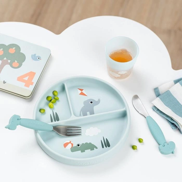 Silikonowy talerzyk z przegródkami dla dziecka – z przyssawką, motyw słonika Elphee i krokodyla Croco.