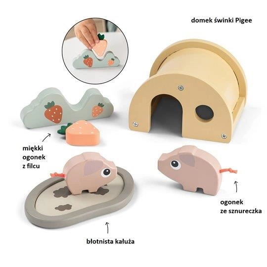 Odkryj urok farmy z drewnianym zestawem zabawek, w którym główną role odgrywa sympatyczna świnka Pigee i jej maluch. Ten zestaw z serii Tiny Farm przenosi maluszka do świata pełnego beztroski, zabawy w błotku i wspaniałej wiejskiej scenerii. Idealny dla dzieci powyżej 2 lat,  które zaczynają rozwijać wyobraźnię. Zestaw zachęca maluchy do tworzenia własnych opowieści.
