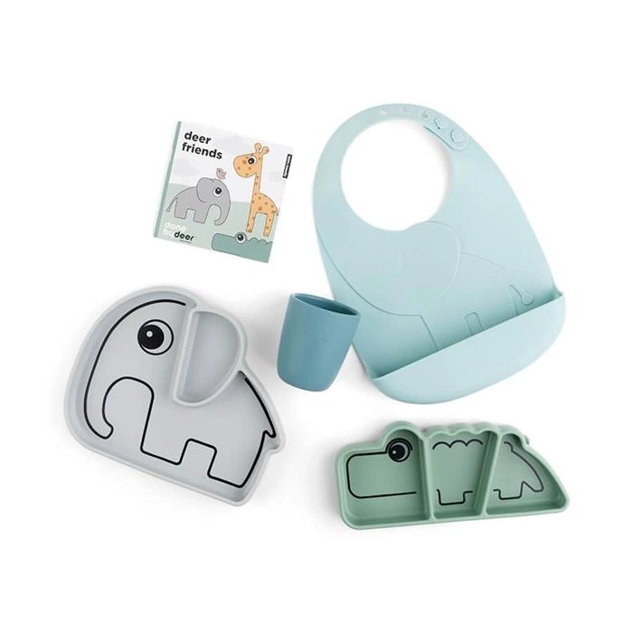 Zestaw Prezentowy Obiadowy Stic&Stay Blue Mix to zbiór bestsellerowych akcesoriów jedzeniowych dla małego smakosza. W uroczym pudełku prezentowym znajdują się silikonowe naczynia: talerzyk z przyssawką Stick&Stay z uroczym Elphiee, talerzyk z przyssawką Stick&Stay w kształcie przyjaznego Croco, poręczny kubeczek, łatwy do czyszczenia śliniak z kieszonką oraz specjalną książeczkę Done by Deer.