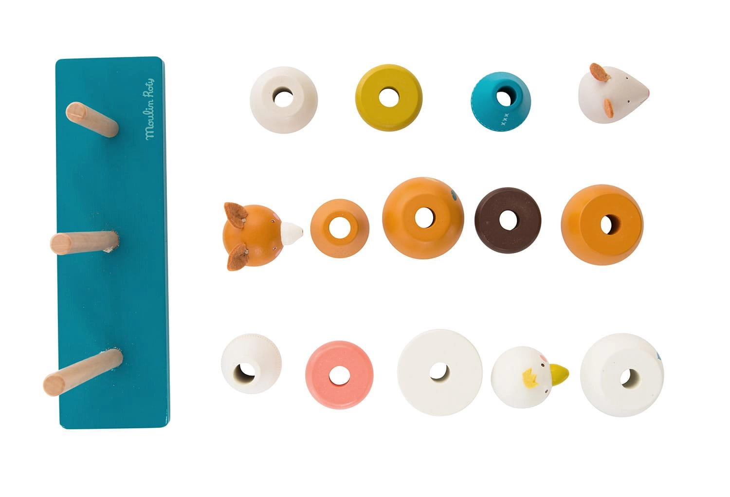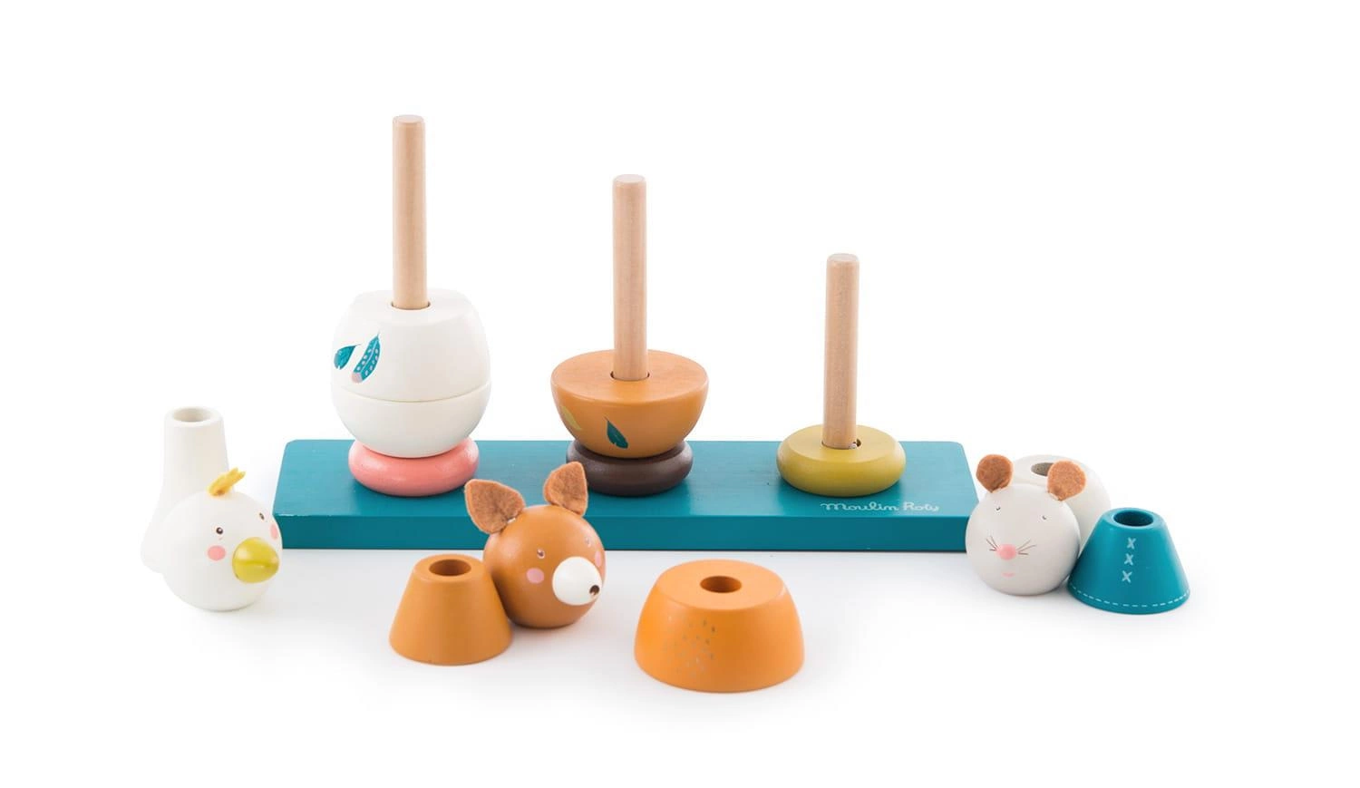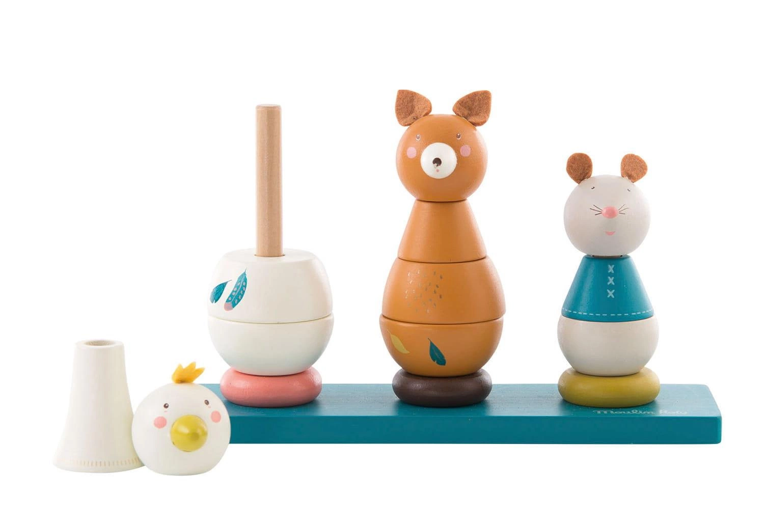 Drewniana zabawka układanka przedstawiająca gąskę, lisa i myszkę. Na niebieskiej drewnianej podstawie znajdują się trzy pręty, na których dziecko układa drewniane elementy tworząc trzy zwierzątka. Podczas zabawy maluch nauczy się różnych kształtów, rozmiarów i kolorów, będzie także rozwijał swoje umiejętności motoryczne. Dziecko będzie się dobrze bawiło montując postacie lub miksując części, aby stworzyć zabawne zwierzęta.