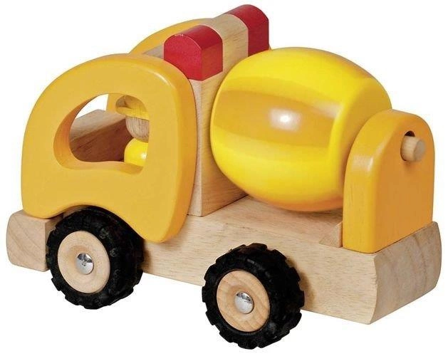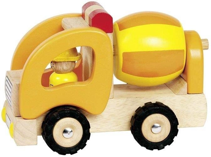 Pomarańczowa betoniarka z ruchomą gruszką, jest gotowa do wylewania betonu na budowie. Gumowe oponki i metalowe osie zapewniają funkcjonalność i solidność. Łatwy do chwycenia przez malucha.