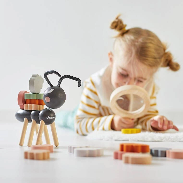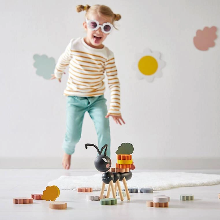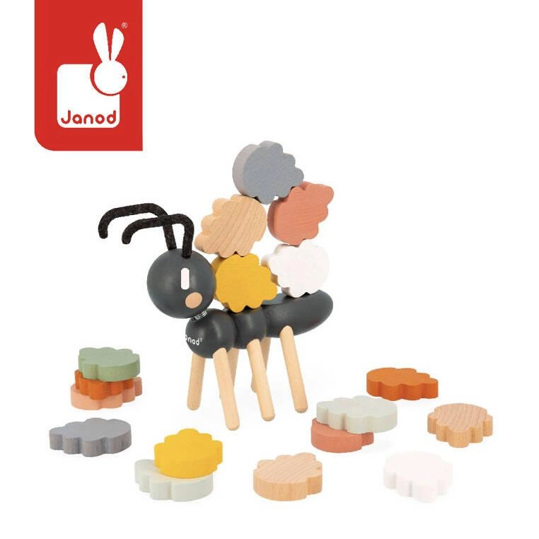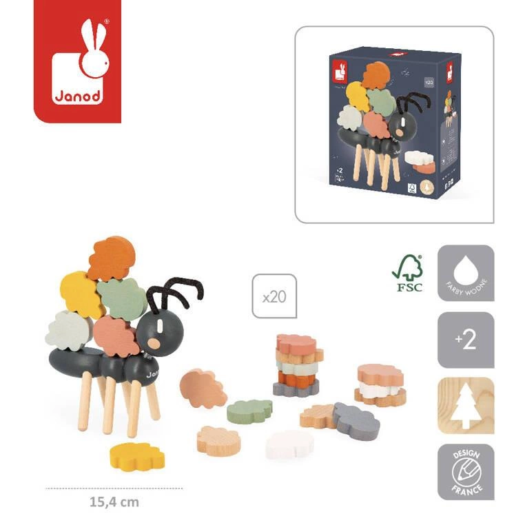Gra zręcznościowa balansowa Mrówka z serii Sweet Cocoon francuskiej marki JANOD to wspaniała zabawa, zarówno dla kilkorga, jak i jednego dziecka. Zestaw składa się z drewnianej czarnej mrówki oraz 20 drewnianych listków dębu w kilku kolorach, które należy na niej umieścić w taki sposób, by z niej nie spadły. Gracz, który doprowadzi do upadku liści – przegrywa.