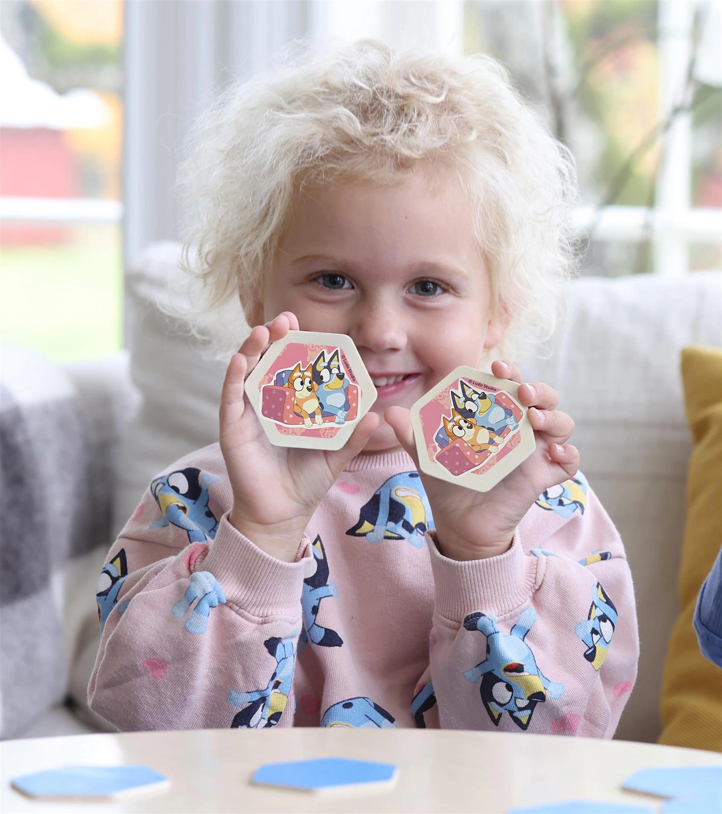 Układaj na stole drewniane kafelki obrazkiem w dół i trenuj swoją pamięć! Urocza gra memory zawiera 38 kafelków w kształcie sześcianu (19 par) z oryginalnymi ilustracjami z kreskówki Bluey. Ta zabawka rozwija pamięć, skupienie oraz zdolność do planowania Twojego dziecka i zaprasza całą rodzinę do zabawy oraz zdobywania nowych doświadczeń w świecie przygód kochanej przez dzieci Bluey. Komplet został zaprojektowany w Szwecji i starannie wykonany z drewna pochodzącego ze zrównoważonych zasobów FSC. Zabawka jest odpowiednia dla dzieci od 3 roku życia.