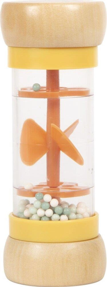 Ta cylindryczna zabawka rozwojowa dla najmłodszych stymuluje przede wszystkim zmysł słuchu oraz wzroku. Przezroczysty plastik zapewnia wyraźny widok niewielkich kuleczek umieszczonych w środku grzechotki. Dziecko może obserwować drobinki spadające przez perforowane dyski, a także pokonujące obracające się w środku śmigło.