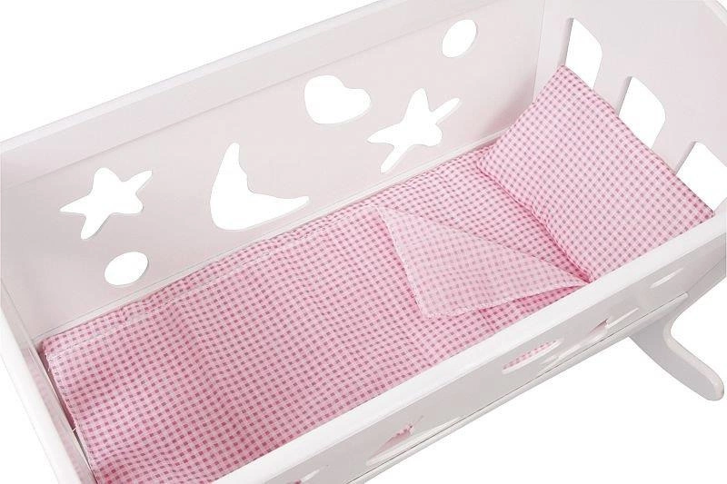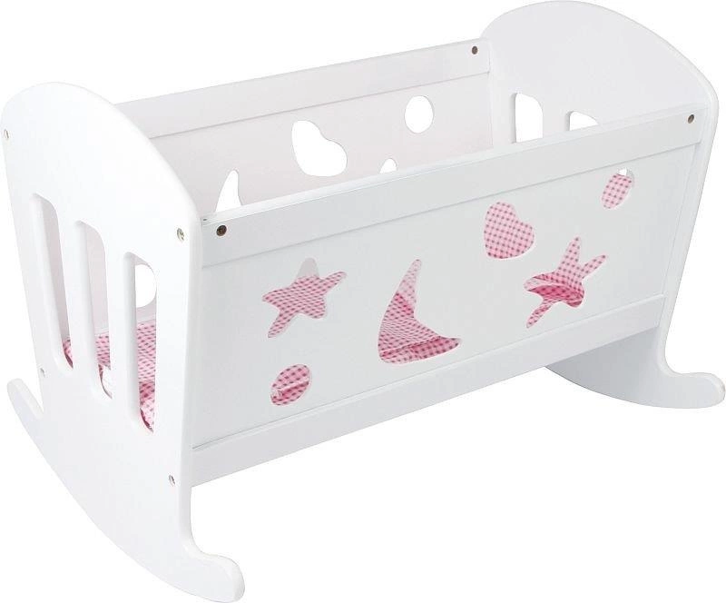 Łóżeczko, kołyska dla lalek - lakierowana na biało z wyciętymi w drewnie motywami: gwiazd, księżyca i słońca ukołysze do snu każdą lalkę. Kołyska wyposażona jest w materac, poduszeczkę oraz kołderkę.
