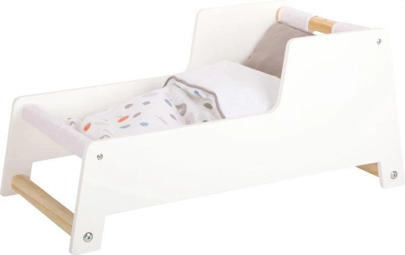 Nowoczesna kołyska na biegunach. Zaprojektowana w skandynawskim stylu, ma subtelną formę. Dwustronna pościel i duży koc zapewniają lalkom i pluszowym zwierzętom o wielkości do 46 cm spokojny sen pod baldachimem. Po zdjęciu płóz i daszku kołyska  przekształca się w stylowy leżak. Wysoka jakość wykonania, stabilna konstrukcja i widoczne elementy z litego drewna sprawiają, że kołyska dla lalek jest stylowym dodatkiem do pokoju dziecięcego