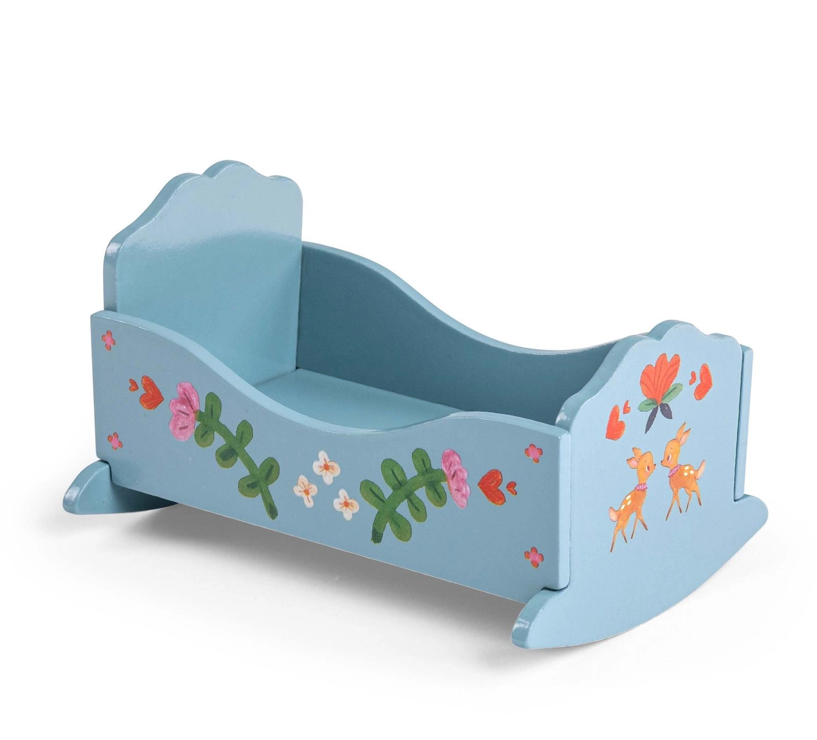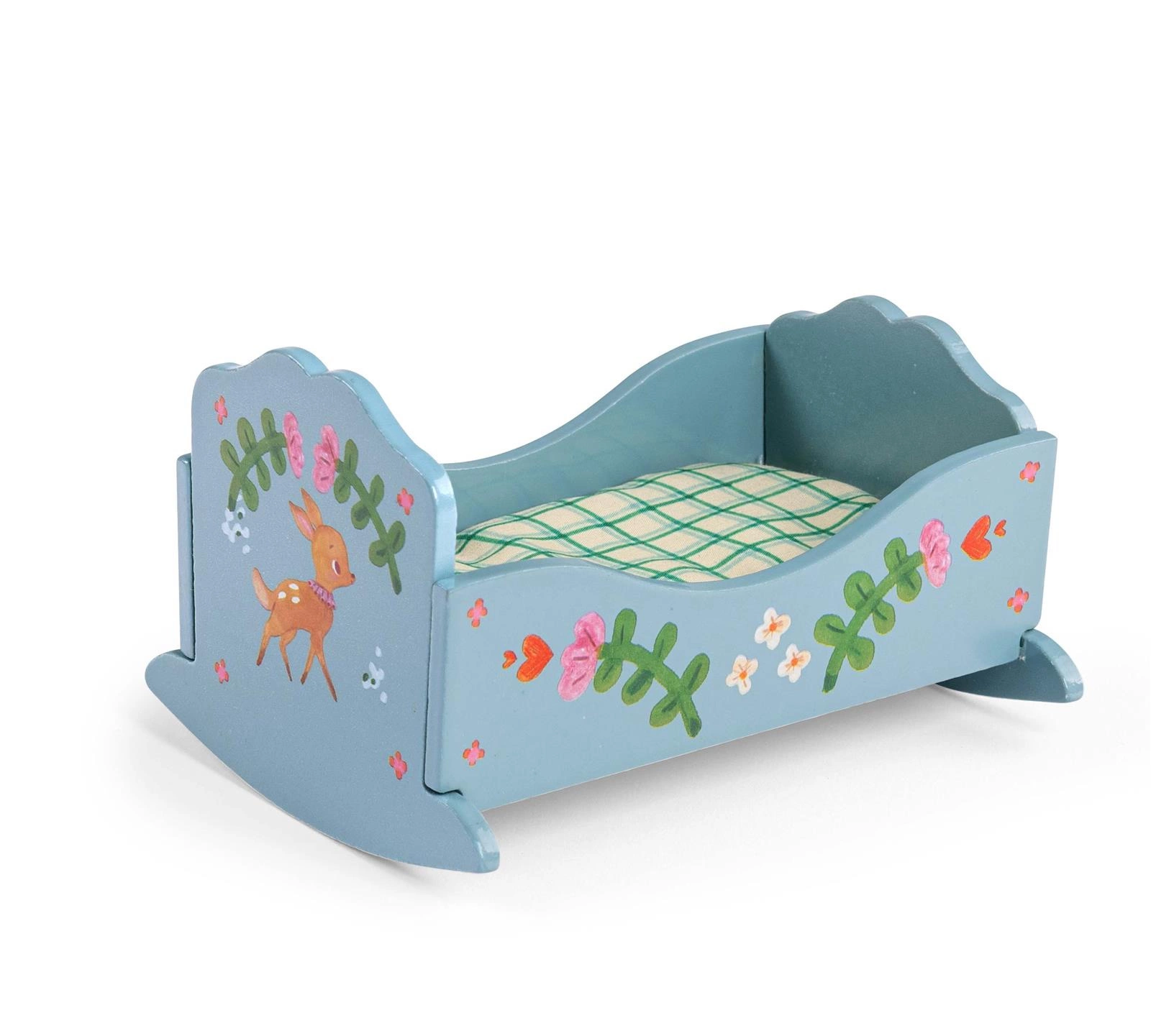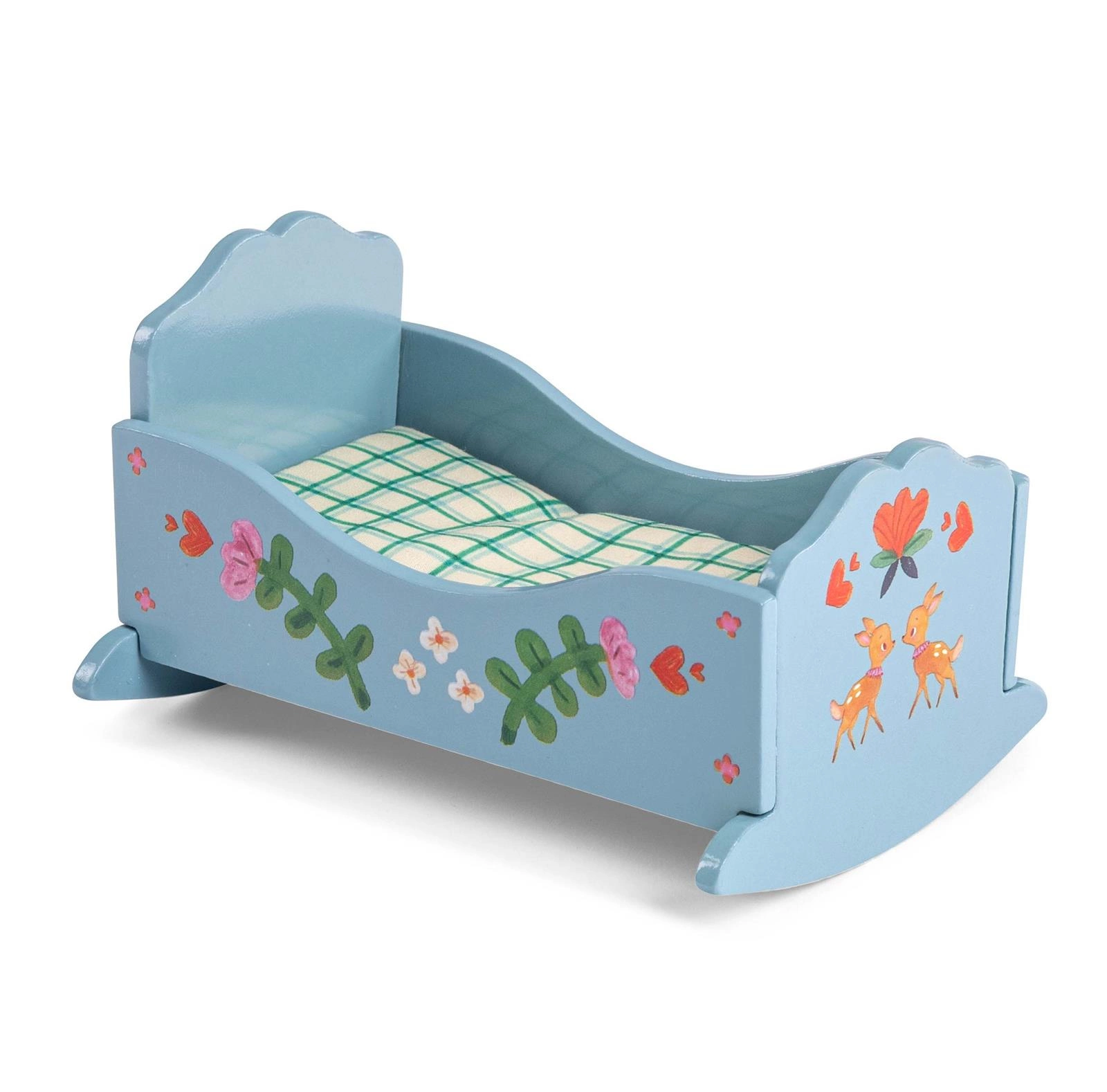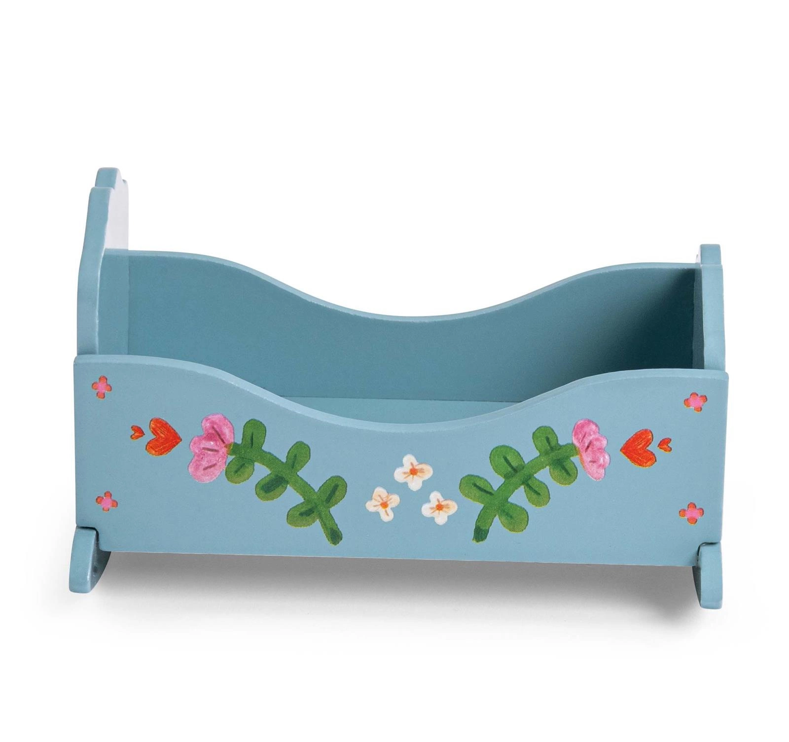Drewniany mebelek zdobiony kwiatowym printem jest przeznaczony do zabawy misiami Bébé z kolekcji Les Minouchkas. Kołyska wyłożona jest mięciutkim materacem w kratę.