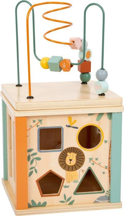 Kostka motoryczna Safari Small Foot to rodzaj drewnianej zabawki edukacyjnej, którą pokocha każdy mały odkrywca. Na każdej ze ścian znajduje się inna zabawa dla dzieci ćwicząca motorykę, logiczne myślenie oraz rozpoznawanie kolorów i kształtów. Dwa labirynty z koralików, gra w dopasowanie kształtów, przesuwany labirynt, obracające się kafelki i gra z kołami zębatymi zapewnią zabawę na długi czas. Przedstawiona w uroczej kolorystyce z motywem Safari oraz elementami naturalnego drewna będzie pasować do każdego wnętrza. Wykonana z drewna wysokiej jakości, solidna i trwała oszczędza miejsce podczas przechowywania, dzięki zdejmowanej pokrywie, którą zamykamy kostkę.