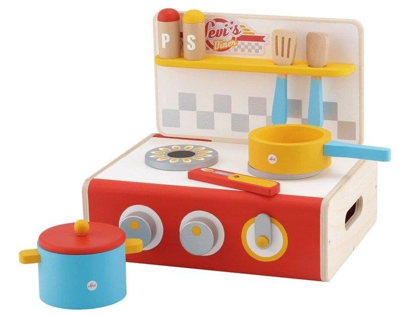 Kuchnia mobilna dla dzieci, oraz wszystkie artykuły wchodzące w skład całego zestawu zostały solidnie wykonane, z dbałością o każdy najmniejszy szczegół. Wszystkie drewniane elementy takie jak: garnek z pokrywką oraz rondelek można postawić na dwóch palnikach. Solniczka i pieprzniczka posłuży do przygotowania doprawionej potrawy oraz drewniane akcesoria kuchenne zamieszają każde przygotowywane danie.