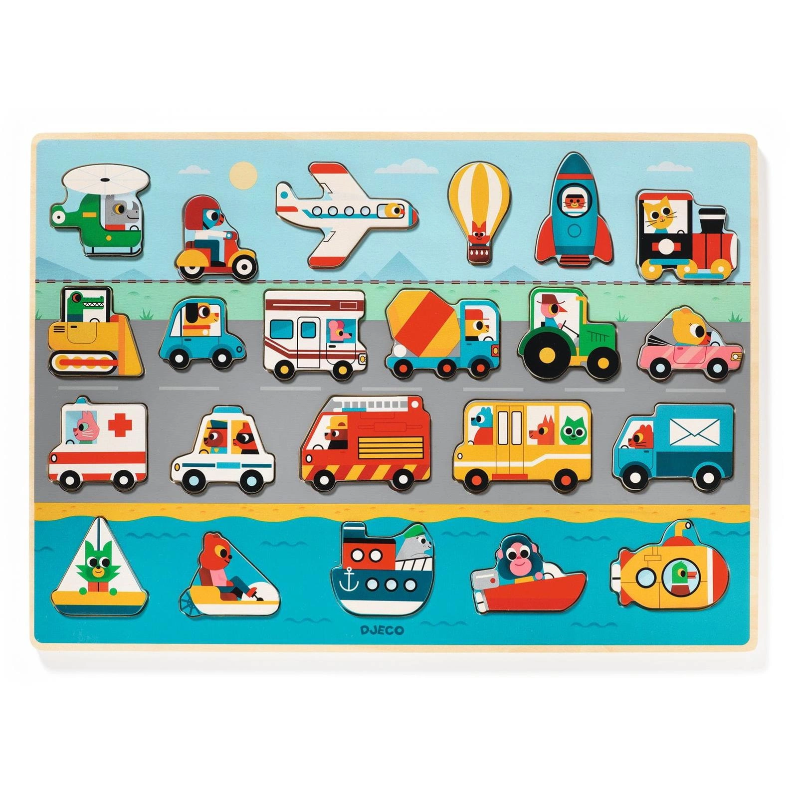 Zawartość: 1 drewniana plansza z otworami, 22 pasujące drewniane elementy w kształcie pojazdów.
