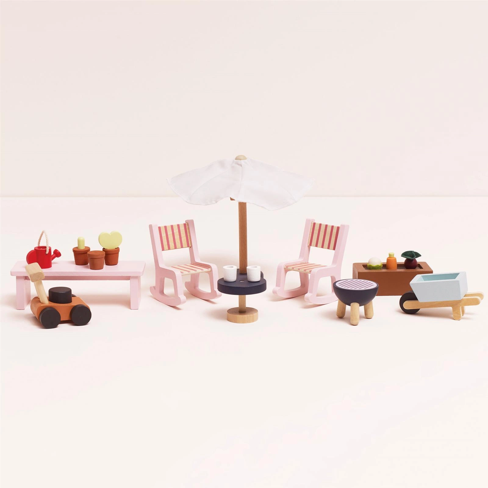 Zestaw został wykonany z naturalnego drewna FSC® i zawiera wszystko, co niezbędne do wspaniałej zabawy: komplet mebli ogrodowych (stół, krzesła i parasol), kubki na napoje, grill, dodatkowy stół do sadzenia roślin, konewkę, doniczki, kosiarkę do trawy oraz taczkę.