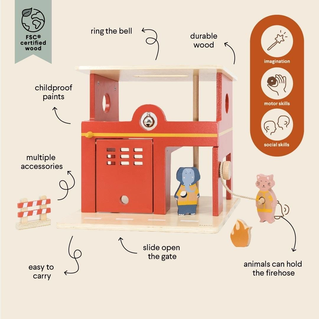 Ktoś potrzebuje naszej pomocy. Dzielny zespół zwierzątek jest gotowy do akcji w tej pięknej drewnianej remizie strażackiej. Chwyć wąż strażacki, otwórz bramę i pędź na miejsce zdarzenia, pozwalając swojej wyobraźni i kreatywności działać na pełnych obrotach. Kiedy nadejdzie czas, aby wrócić do domu po dobrze wykonanej pracy, wygodny uchwyt ułatwia przenoszenie. Skład: MDF FSC® - drewno bukowe FSC® - sklejka FSC® Rekomendowany wiek: 3y+ Wymiary (Dł. x Sz. x Wys.): 25,5 x 22,5 x 25 cm