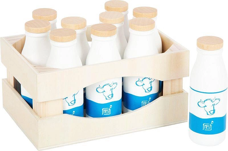 Żaden market nie obejdzie się bez mleka. Drewniana skrzynka do zabaw w sklep z aż 10 butelkami do mleka Small Foot uzupełni asortyment każdego małego sprzedawcy!