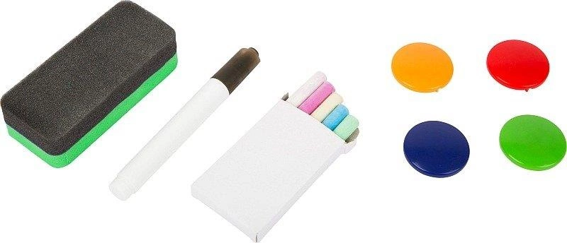 Dodatkowo wszystko co potrzebne do wesołej zabawy znajdziemy w plastikowym pudełku przymocowanym do tafli. Kreatywny zestaw zawiera: gąbkę, kredę, markery i magnesy czyli niezbędnik każdego małego rozrabiaka.