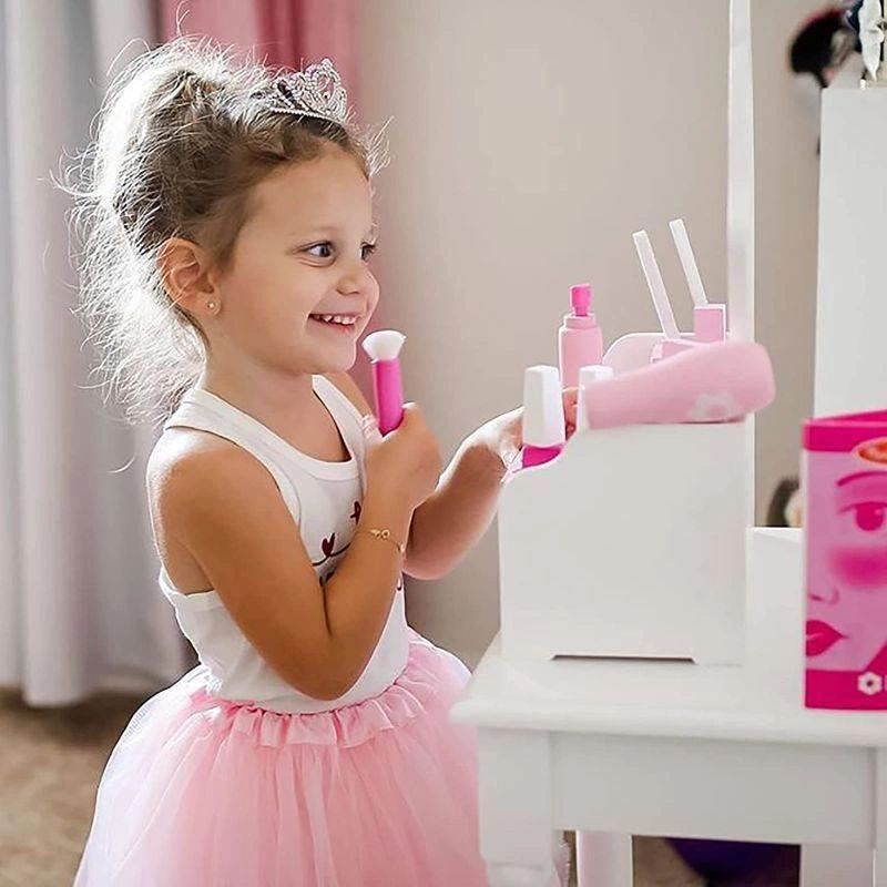 Drewniana toaletka z akcesoriami Beauty Salon Melissa & Doug to 18-elementowy komplet dla dzieci z akcesoriami do makijażu i pielęgnacji włosów i paznokci rozwijający wyobraźnię i kreatywność najmłodszych. Wytrzymała, drewniana toaletka z blatem i lusterkiem bezpiecznym dla dzieci oraz szufladą na akcesoria to gwarancja wspaniałej zabawy. W Beauty Salon znajdują się wszystkie niezbędne narzędzia do pracy, takie jak: suszarka do włosów, prostownica, grzebień, szczotka, balsam z zamknięciem typu flip top szminka, dwie butelki lakieru do paznokci, róż, pędzel do makijażu, cień do powiek i aplikator do nakładania cieni. Pastelowa kolorystyka toaletki Melissa and Doug wraz ze wszystkimi realnie wyglądającymi akcesoriami przeniesie najmłodszych w świat fantazji.