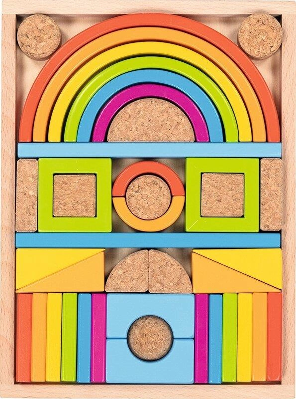 Składająca się z kolorowych klocków, drewniana układanka 3D w pudełku marki Goki to prawdziwe wyzwanie dla kreatywnych małych rączek. Poszczególne elementy zestawu różnią się od siebie kolorem i kształtem. Kolorowy zestaw drewnianych (30 el.) i korkowych (10 el.) klocków oferuje nieskończone możliwości urozmaiconej zabawy. Wykorzystując zawarte w zestawie elementy mały konstruktor będzie miał możliwość ułożyć tęczę lub np. kolorowy tunel dla autek. Pomimo możliwych sugestii dotyczących przeznaczenia klocków pamiętajmy, że to sam maluch ostatecznie zadecyduje o tym co powstanie z nich powstanie. Między innymi właśnie możliwość stworzenia dowolnej konstrukcji jest czynnikiem wywołującym tak olbrzymi zachwyt dziecka.