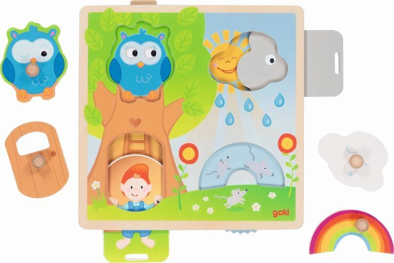 - drugą część dokazywań ukryto nieco głębiej w lesie... Przesuwajcie kieszonki i kręćcie kołem zębatym, aby odkryć tajemnice skrywane przez drewnianą układankę interaktywną pogoda Goki!