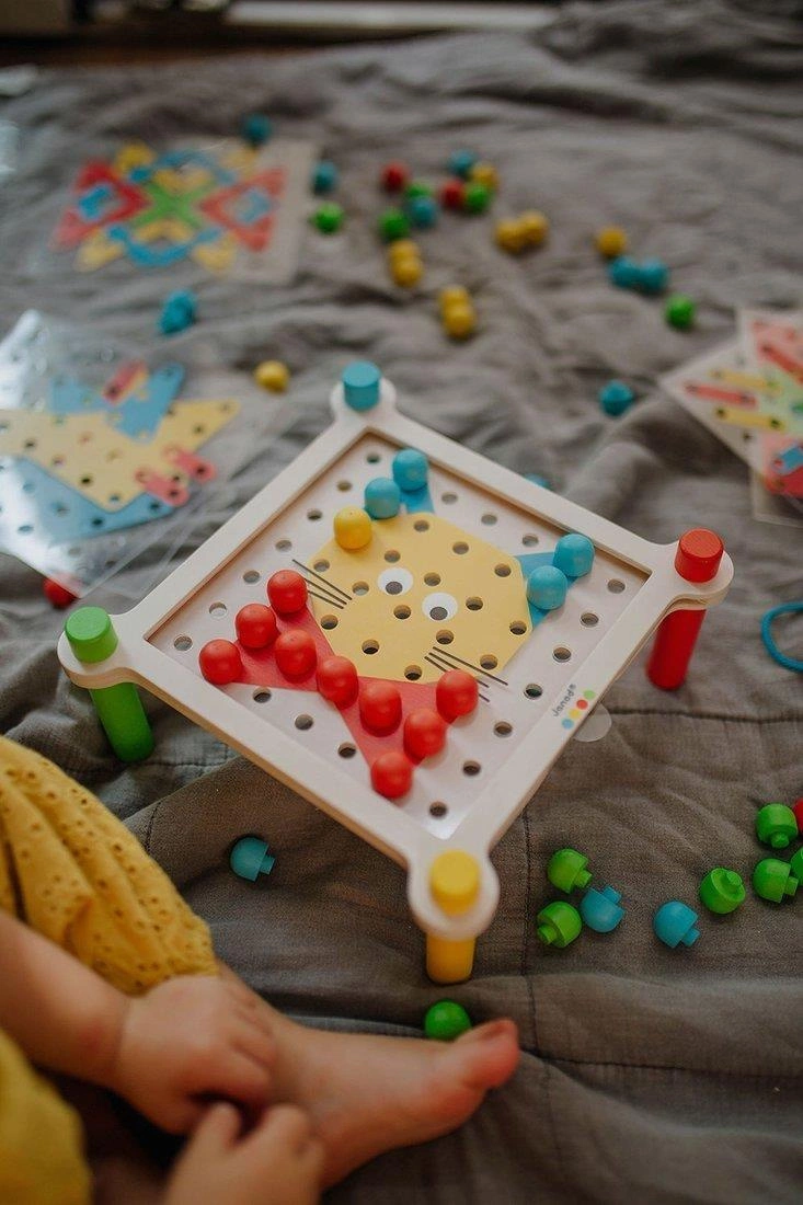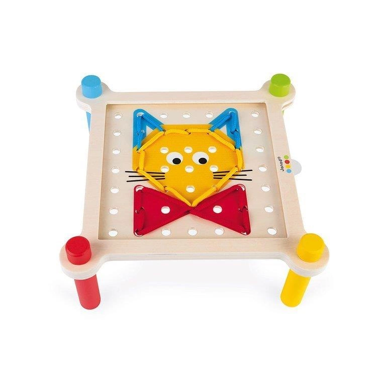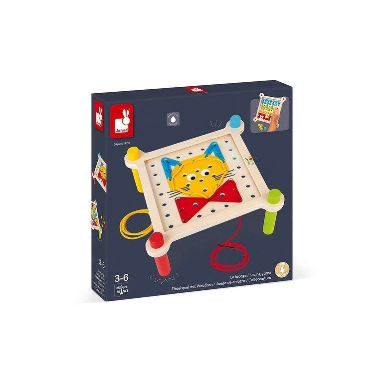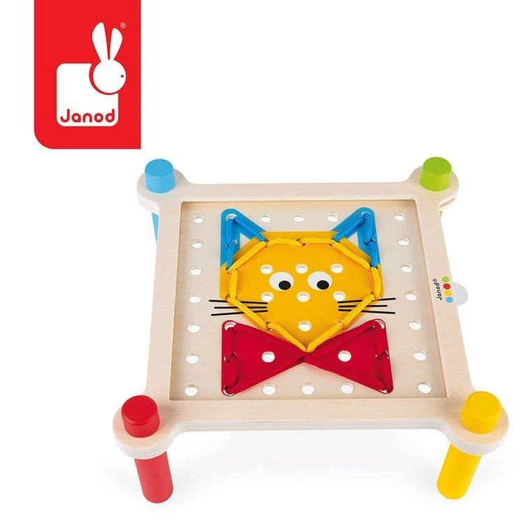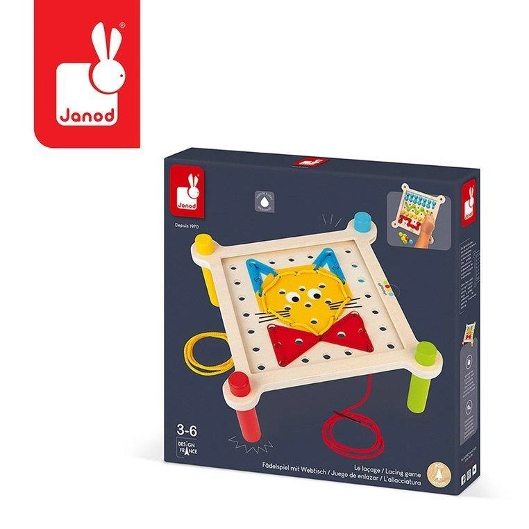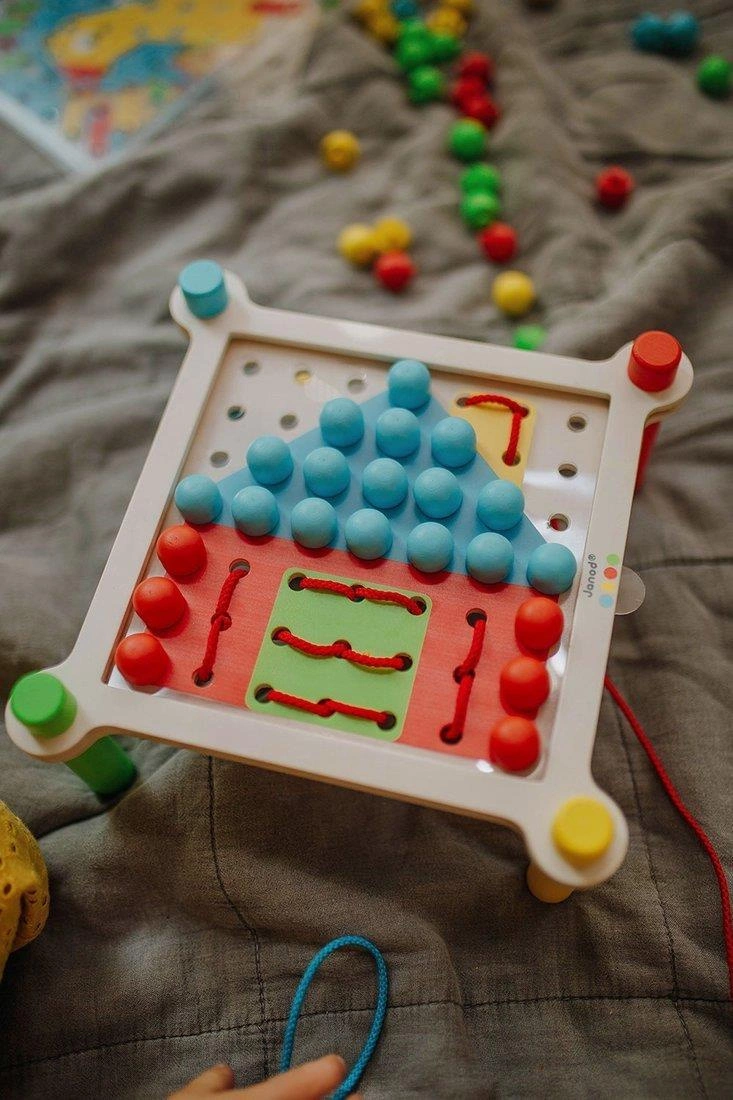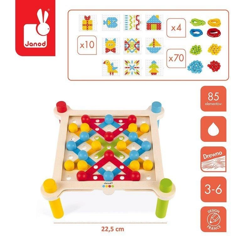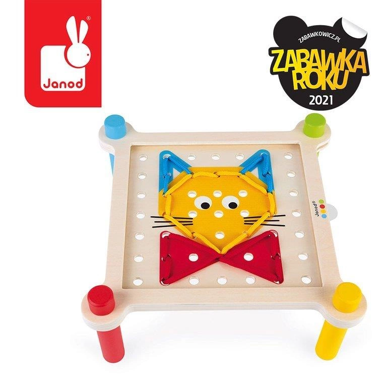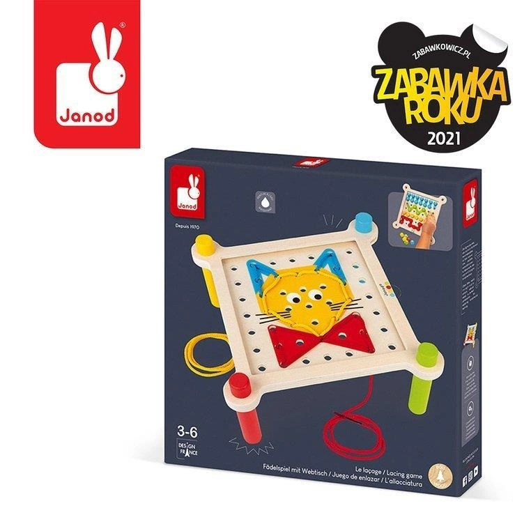 Drewniana przeplatanka z serii Essentiel francuskiej marki JANOD rozwija u dziecka wiele kluczowych umiejętności, m.in. koordynację ręka-oko oraz rozróżnianie kształtów i kolorów, uczy także koncentracji, spostrzegawczości i cierpliwości. W skład zestawu wchodzi podstawka na nóżkach, w którą wsuwa się przeźroczyste plansze z różnymi grafikami (do wyboru jest 10 plansz). Zarówno w planszach, jak i na podstawce, znajdują się otwory, przez które należy przeplatać dołączone do zestawu kolorowe sznurki (4) lub umieszczać w nich plastikowe guziczki (70) w odpowiadających grafikom intensywnych kolorach (żółtym, niebieskim, czerwonym i zielonym).