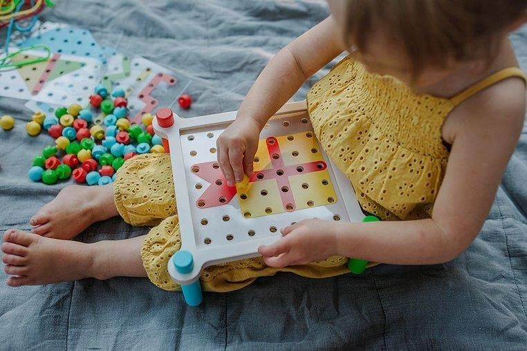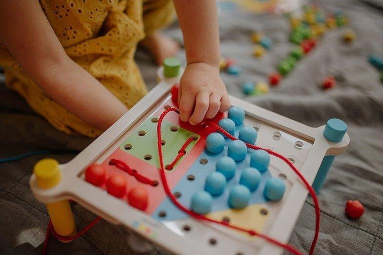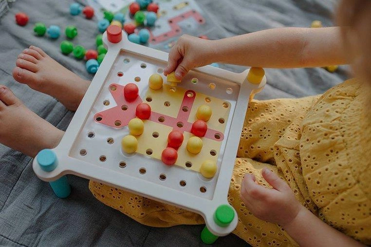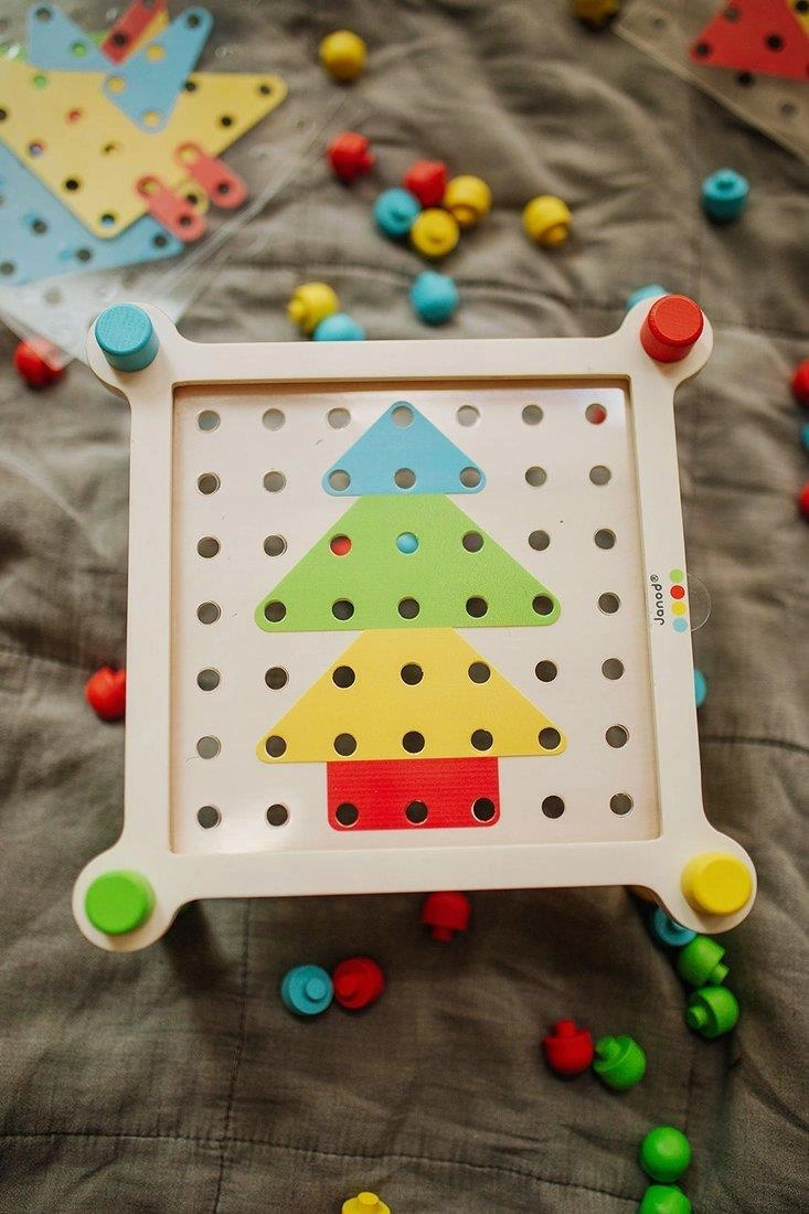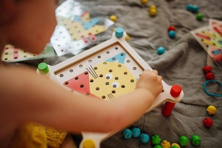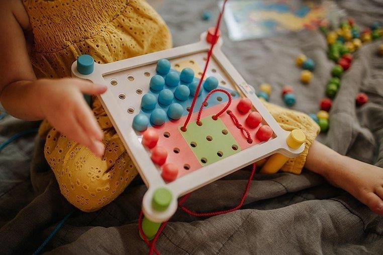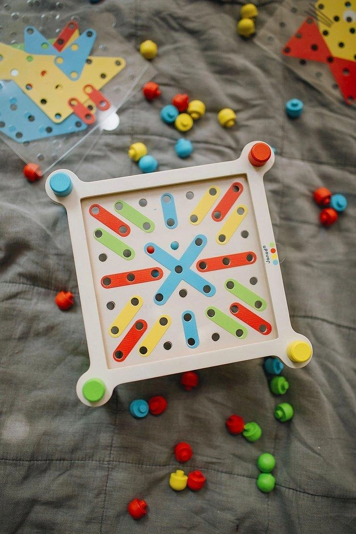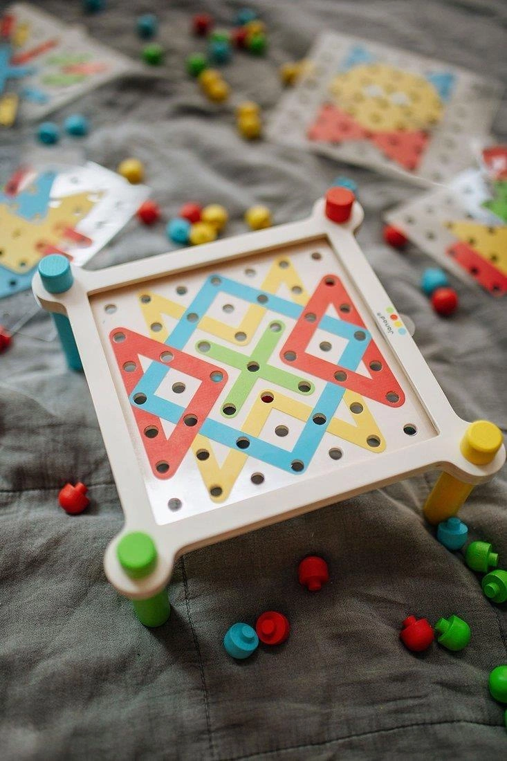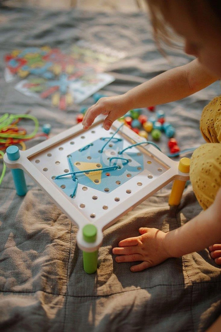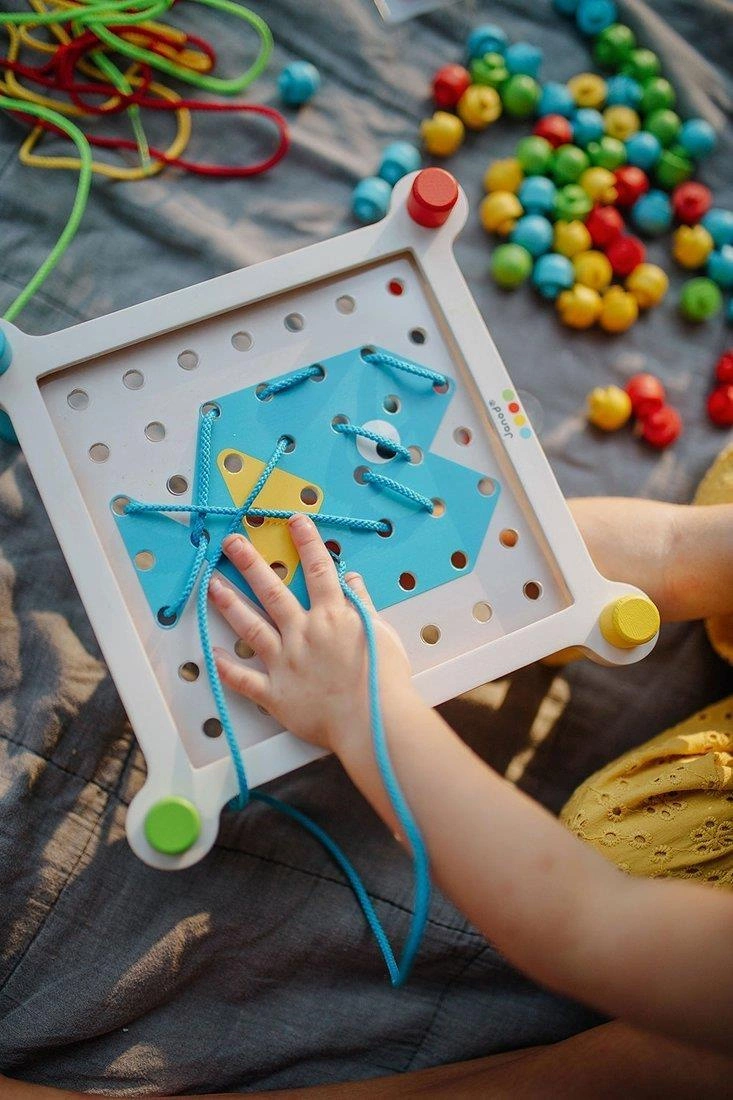 Drewniana przeplatanka z serii Essentiel francuskiej marki JANOD rozwija u dziecka wiele kluczowych umiejętności, m.in. koordynację ręka-oko oraz rozróżnianie kształtów i kolorów, uczy także koncentracji, spostrzegawczości i cierpliwości. W skład zestawu wchodzi podstawka na nóżkach, w którą wsuwa się przeźroczyste plansze z różnymi grafikami (do wyboru jest 10 plansz). Zarówno w planszach, jak i na podstawce, znajdują się otwory, przez które należy przeplatać dołączone do zestawu kolorowe sznurki (4) lub umieszczać w nich plastikowe guziczki (70) w odpowiadających grafikom intensywnych kolorach (żółtym, niebieskim, czerwonym i zielonym).