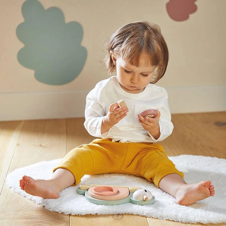 Drewniana układanka sensoryczna z serii Sweet Cocoon francuskiej marki JANOD to zabawka, rozwijająca małą motorykę, koordynację ręka-oko, sprawność dłoni i palców, stymulująca zmysły oraz rozbudzająca ciekawość. W zestawie jest podkładka-ślimak, na której można układać drewniane elementy – od największego do najmniejszego. Każdy z tych elementów na ponadto strukturę, która stymuluje zmysł dotyku. Zabawka została zaprojektowana we Francji. Zapakowana jest w estetyczne kartonowe pudełko. Idealnie nadaje się na prezent.