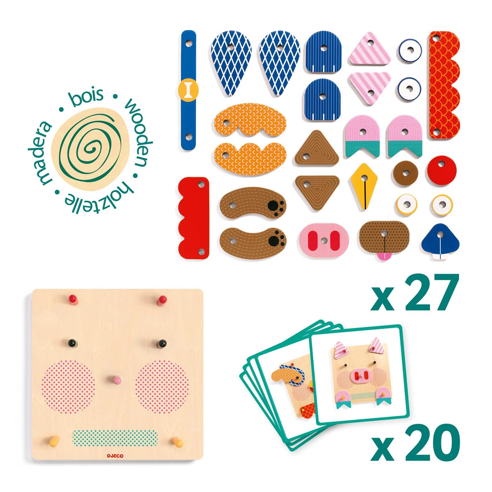 Zawiera 27 drewnianych elementów i 20 kart ze