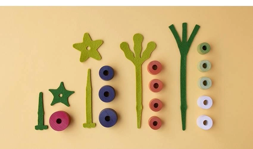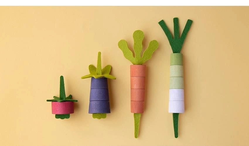 Spraw, by Twój ogród warzywny rósł! Nawlekanka - układanka z drewnianymi i filcowymi elementami aby stworzyć swoje warzywa.