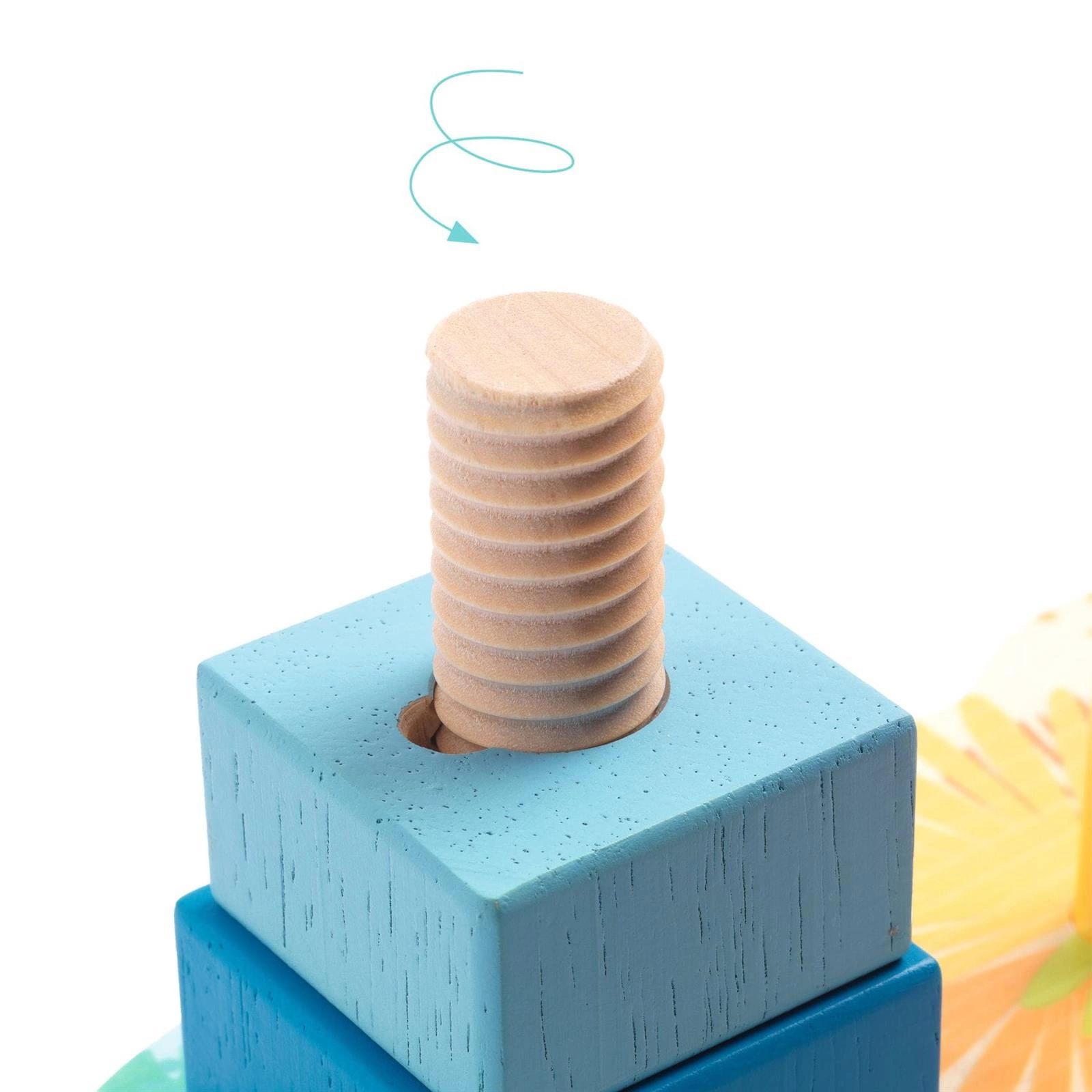 Zawartość: 1 drewniana podstawka z 3 wystającymi uchwytami, 9 drewnianych kolorowych elementów.