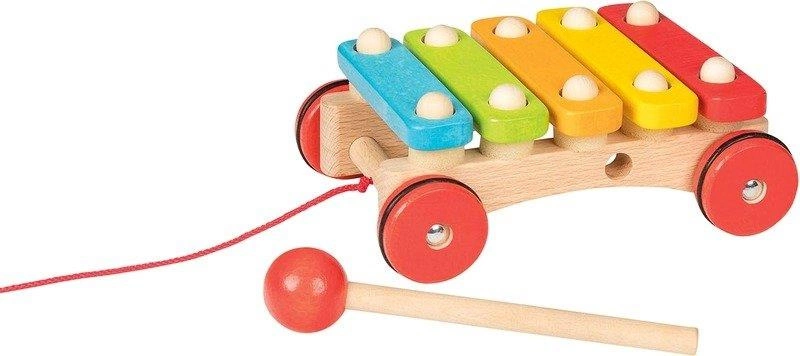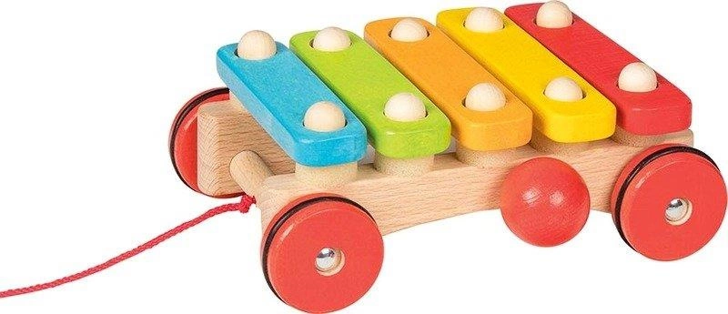 Drewniana zabawka do ciągnięcia Muzyczny spacer marki Goki jest wyposażona w cymbałki, na których najmłodsi mogą wystukiwać piękne melodie. Dodatkowym atutem jest miejsce na pałeczkę, aby nie zgubić jej w trakcie podróży. Kółeczka posiadają gumowe nakładki, dzięki czemu poruszanie pojazdu staje się prawie bezgłośne.