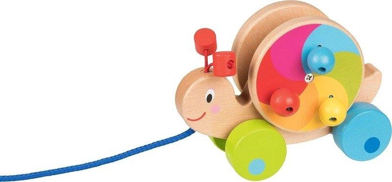 Drewniana zabawka do ciągnięcia Ślimaczek w podróży marki Goki pomalowana na piękne tęczowe kolory sprawdzi się jako mały pupil dla naszego smyka. Zwierzątko porusza się na czterech barwnych kółeczkach, jego domek możemy odczepić i wykorzystać do turlania po ziemi między sobą. Jego czułka przyczepione na gumeczkach zabawnie się chyboczą podczas spaceru co dodaje uroku temu sympatycznemu gadowi.