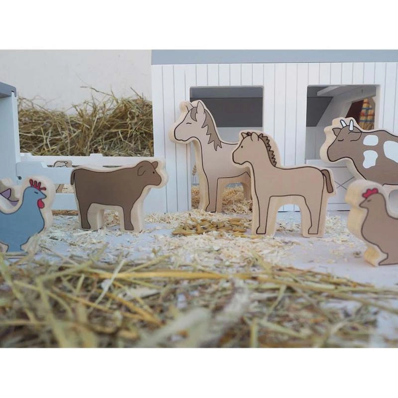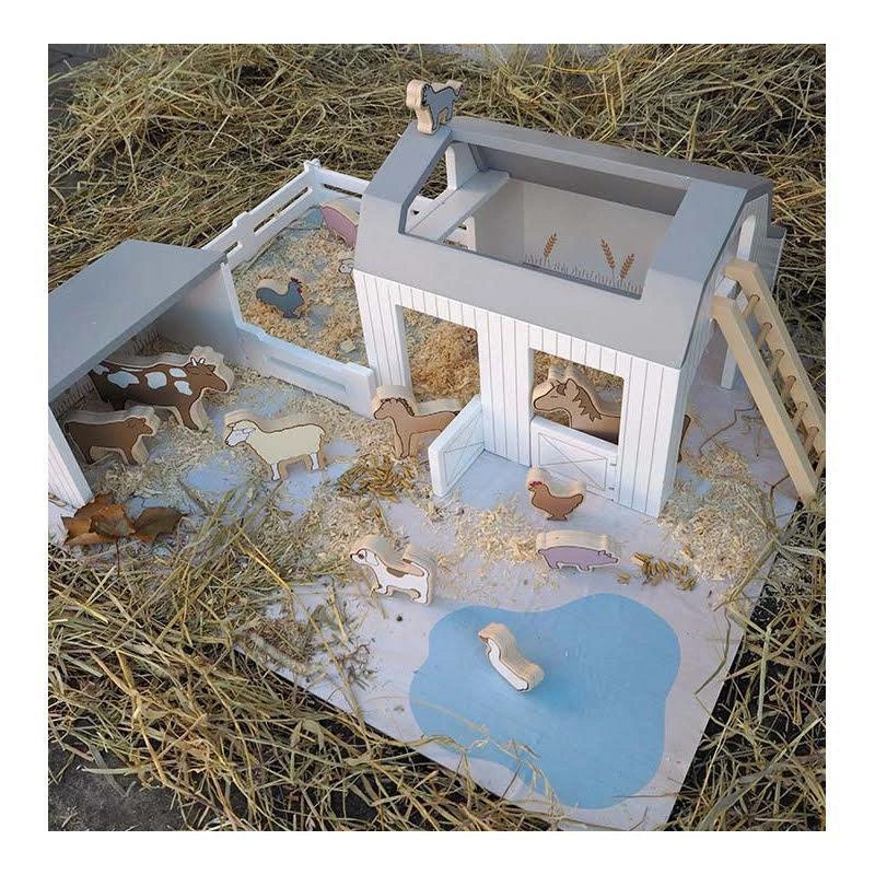 Nasza drewniana zagroda, nie wymaga samodzielnego montażu, jest gotowa do użycia. Podstawa jest wykonana z grubej, twardej tektury a farma wykonana jest z drewna. Składa się z małej stajni z otwieranymi drzwiami przeznaczonej dla koni, oraz większego budynku zagrody przeznaczonej dla pozostałych zwierząt.