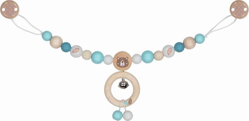 Mnóstwo drewnianych koralików zachęca do wyciągania rączek i pierwszych zabaw manualnych. W centralnym punkcie zawieszki do wózka z klipsami znajduje się obręcz do łapania z atrakcją w postaci dzwoneczka.