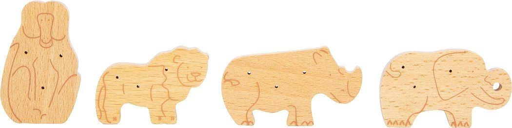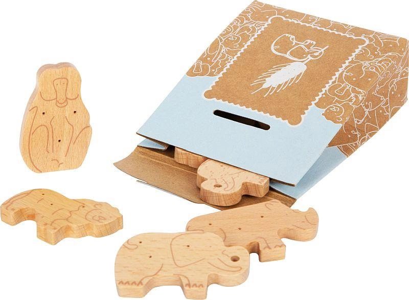 W zestawie znajduje się 8 krakersów wykonanych z solidnego drewna: 2 lwy, 2 nosorożce, 2 małpki oraz 2 słonie.