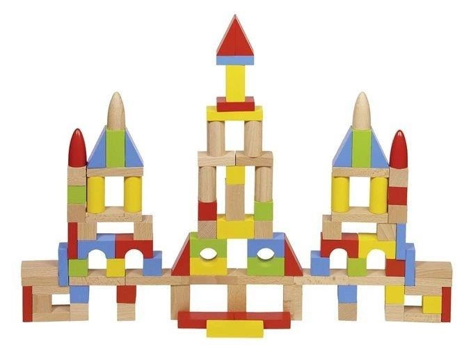 Drewniane klocki w bawełnianym worku, 100 el., 8 kształtów, goki basic.