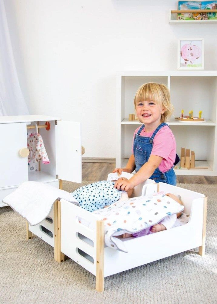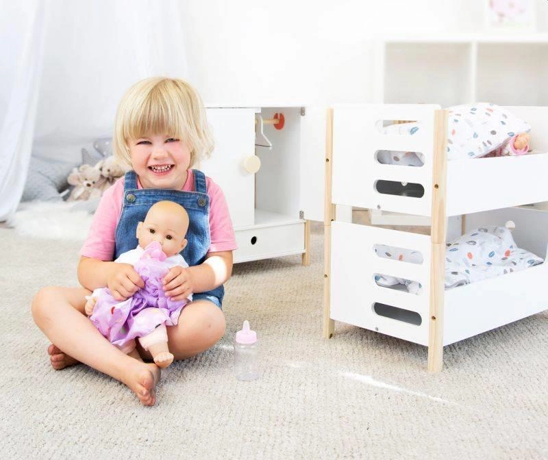 Łóżko piętrowe z pościelą w urocze kropeczki. Robi wrażenie swoją funkcjonalnością- można je rozmontować na dwa samodzielne łóżka. Dzięki skandynawskiemu designowi będzie pasować do wnętrza pokoju dziecięcego. Lalki i pluszaki o wielkości do 46 cm mogą spać wyjątkowo wygodnie i spokojnie. Szuflady stanowią dodatkową przestrzeń do przechowywania. Wstępnie zmontowane części ułatwiają montaż.