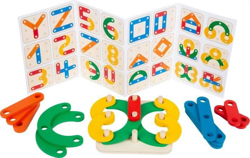 Drewniana plansza z wystającymi palikami i 20 kolorowych elementów pozwalają tworzyć kreatywne kompozycje a także w czasie zabawy poznawać litery i cyfry. Do zestawu dołączone są szablony które ułatwią zabawę na początkowym etapie poznawania zabawki.  Wszystkie elementy są zapakowane w estetyczną, drewnianą skrzyneczkę ułatwiającą przechowywanie.