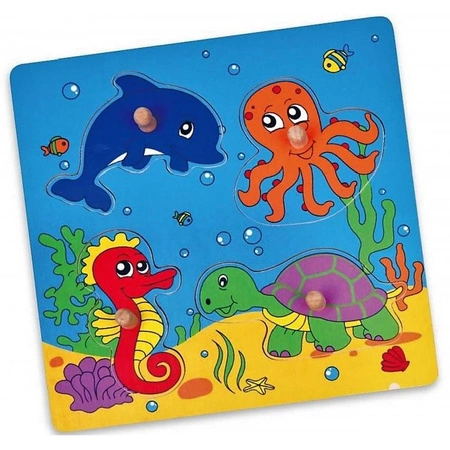 Drewniane puzzle z mieszkańcami morza od renomowanej marki Viga to jedna z czołowych zabawek, która posłuży nie tylko jako tradycyjna układanka, ale pozwoli dziecku ćwiczyć zdolności manualne oraz rozpoznanie kształtów zwierząt. Taka gra dla dziecka od 12 miesiąca życia pomoże kształtować precyzję ruchów rączek, oraz poprawić koordynację wzrokowo-ruchową, a także ćwiczyć pamięć, logiczne myślenie i koncentrację. Kolorowe puzzle cieszą oko i zachęcają do zabawy. W zestawie znajdują się 4 puzzle z różnymi zwierzętami o różnych kształtach. Puzzle posiadają uchwyty, dzięki którym maluch z łatwością będzie mógł je podnosić i układać w pasujące miejsce na planszy.
