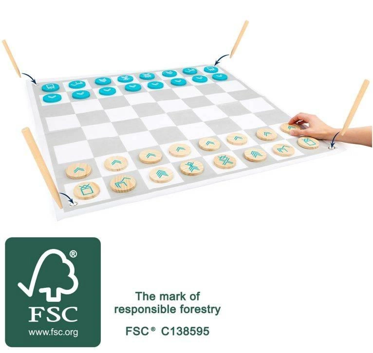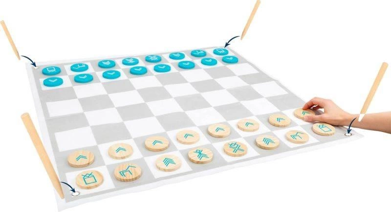 Zestaw do gry w szachy i warcaby od Small Foot to idealne rozwiązanie dla miłośników obu tych propozycji. Dużych rozmiarów plansza została przystosowana do użytku na zewnątrz i jest mocowana w ziemi za pomocą czterech drewnianych drążków. Elementy do gry  wykonane w 100% z drewna z certyfikatem FSC® i utrzymane w jasnoniebieskim kolorze. Cechą wyróżniającą zestaw gier od innych są oznaczenia pionków, które przedstawiają rodzaje ruchów w grze w szachy. Pomaga to początkującym graczom zapamiętać i opanować zasady i przebieg gry. Wspaniały pomysł na zabawę w parku oraz ogrodzie, którą polubi każdy młodszy oraz starszy gracz.