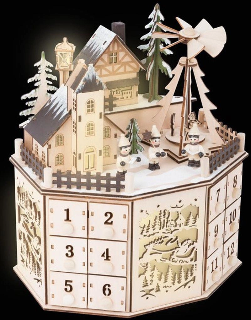 Podstawę kalendarza z drewna dekorują misternie powycinane obrazki o tematyce świątecznej. Zarówno maluchy, jak i dorośli nie będą mogli oderwać oczu od światła sączącego się przez płytki o wyglądzie matowego szkła.