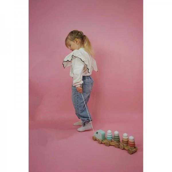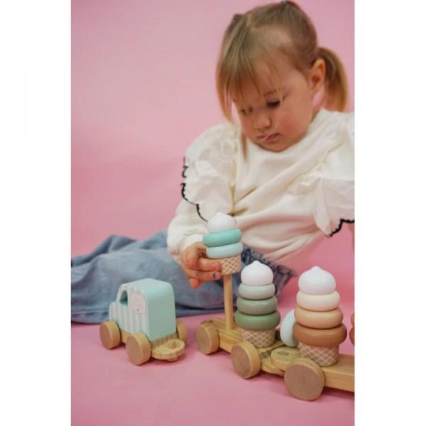 Drewniany pociąg z lodami do ciągnięcia skandynawskiej marki Jabadabado, to  zabawka w której, dzieci mogą stworzyć własne lody marzeń! Układaj, buduj i ciągnij go i baw się na całego! Ten uroczy drewniany pociąg pełen smakowitych lodów jest gotowy na każdą kreatywną przygodę – niezależnie od tego, czy organizujesz sklep z lodami, food tracka czy piknik w pokoju dla swoich najbliższych. W zestawie znajdują się 4 lody w delikatnych pastelowych kolorach, które dzieci mogą układać, tworzyć własne kompozycje i serwować je swoim zabawkowym gościom. Zabawka rozwija wyobraźnię, jednocześnie pomagając dzieciom doskonalić motorykę małą poprzez układanie i aranżowanie elementów oraz ciągnięcie wózka, doskonale wpływają na rozwój koordynacji ręka-oko. Zabawka  dedykowana dzieciom w wieku 18 miesięcy dzieci , jest to bardzo ważny etap w rozwoju dziecięcym, w którym pojawiają się umiejętności posługiwania się dłońmi i palcami. Rozwój motoryki małej w tym wieku ma również wpływ na późniejsze umiejętności, takie jak nauka pisania, rysowania, ubierania się, czy korzystania z różnych narzędzi. Zabawy rozwijające motorykę małą pomagają dzieciom w osiąganiu tych celów poprzez naturalną, przyjemną zabawę. Zawartość zestawu: 4x lody z krążkami do układania w pastelowych kolorach 1x pociąg do ciągnięcia z sznurkiem Wymiary : 11,5 x 35 x 6,6 cmWiek: 18 msc+ Jabadabado to szwedzka firma istniejąca na rynku od 1993 roku specjalizująca się w projektowaniu i produkcji zabawek drewnianych, elementów wyposażenia pokoi dziecięcych. Wszystkie produkty Jabadabado cechuje oryginalny design, piękna kolorystyka i niezwykle staranne wykonanie. Wszystkie zabawki marki Jabadabado stworzone są z myślą o dzieciach i pobudzają do kreatywnej zabawy. 100% FSC – Przyjazne dla środowiska Zabawka posiada certyfikat FSC, co oznacza, że drewno użyte do produkcji pochodzi z odpowiedzialnych, zrównoważonych źródeł. Certyfikat FSC (Forest Stewardship Council) zapewnia, że drewno wykorzystywane do produkcji pochodzi z lasów zarządzanych w sposób odpowiedzialny, dbając o ekosystemy i społeczeństwo. Wybierając zabawkę z tym certyfikatem, wspieramy ochronę naszych zasobów naturalnych i dbamy o przyszłość planety.
