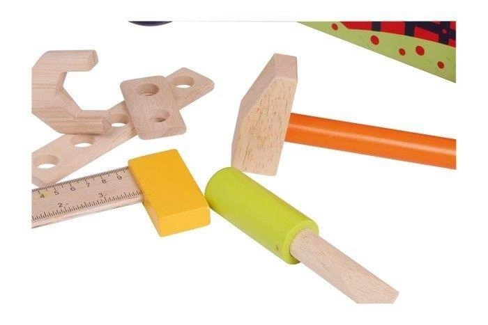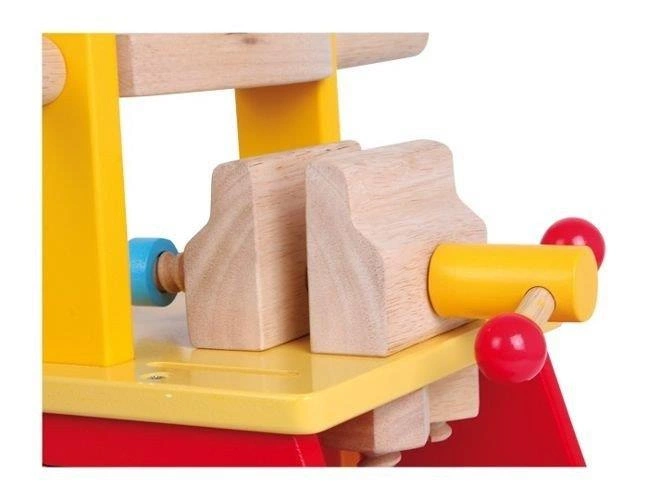 Drewniany samochód to wielofunkcyjna zabawka dla najmniejszych dzieci, dedykowana jako zabawka dla chłopców, która z pewnością szybko się nie znudzi. Drewniany samochód to rodzaj zabawki edukacyjnej. Może być traktowany także jako: pojazd dla dziecka (posiada koła z gumowymi obwódkami), sorter dzięki któremu maluch pozna figury geometryczne i nauczy się dopasowywać je do odpowiednich miejsc oraz warsztat dla dzieci na kółkach, który jest wyposażony w drewniane narzędzia dla dzieci.  Dzięki swojej mobilności mały majsterkowicz będzie mógł dotrzeć z warsztatem wszędzie tam, gdzie będzie potrzebny. Siodełko autka z wieloma otworami to zarazem miejsce do wkręcania śrub, pod nim natomiast znajduje się dużo miejsca do przechowywania narzędzi dla dzieci, czy też innych zabawek. Odkręcane imadło można przymocować również w innym miejscu siodełka, tak jak zdecyduje mały majsterkowicz !