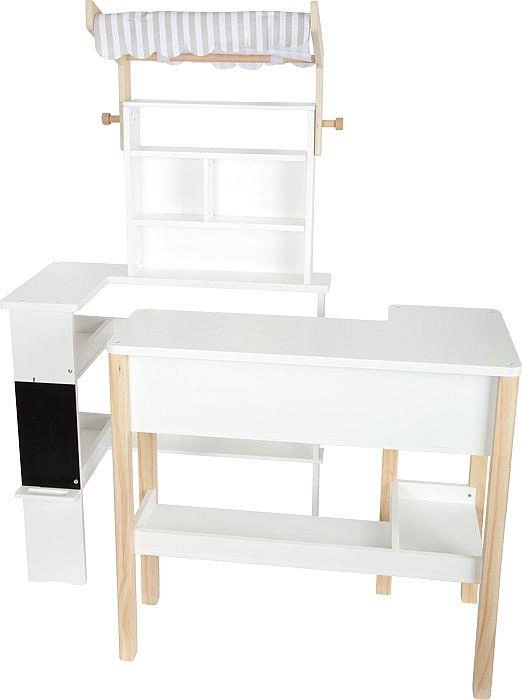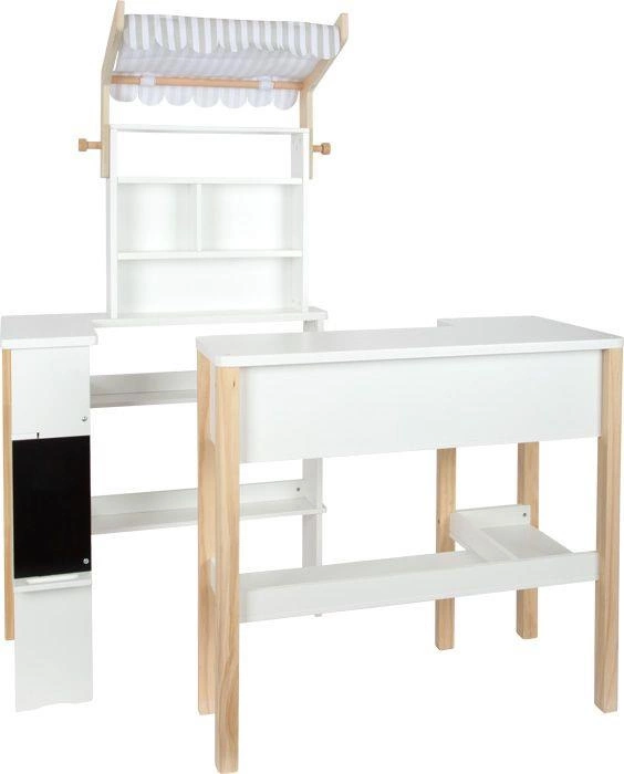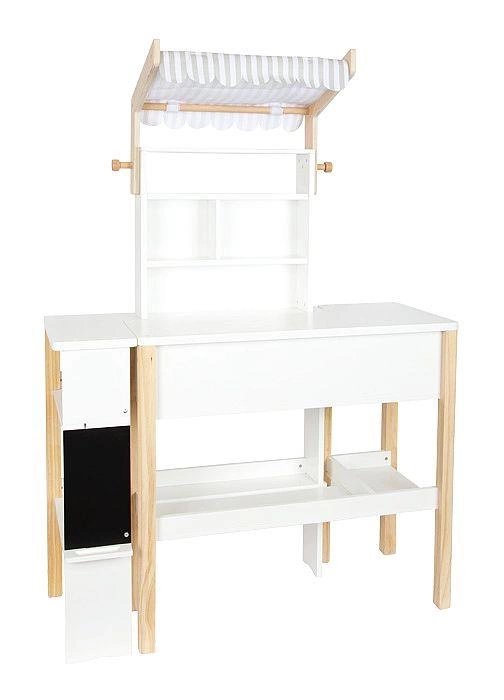 Kompaktowy, drewniany stragan dla dzieci ze zdejmowaną markizą z tkaniny spodoba się każdemu maluchowi, który robi zakupy z rodzicami!