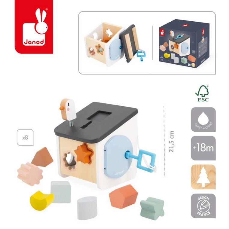 Drewniany sorter Domek dla ptaszków z serii Sweet Cocoon francuskiej marki JANOD to zabawka, rozwijająca małą motorykę, koordynację ręka-oko oraz rozbudzająca ciekawość. W zestawie jest zamykany na kluczyk domek z ptaszkiem na dachu oraz otworami w ściankach, przez które należy wrzucać do środka klocki w odpowienich kształtach. Klocków jest 8. Zabawka została zaprojektowana we Francji. Zapakowana jest w estetyczne kartonowe pudełko. Idealnie nadaje się na prezent.
