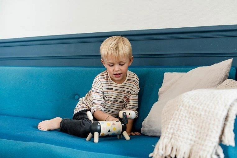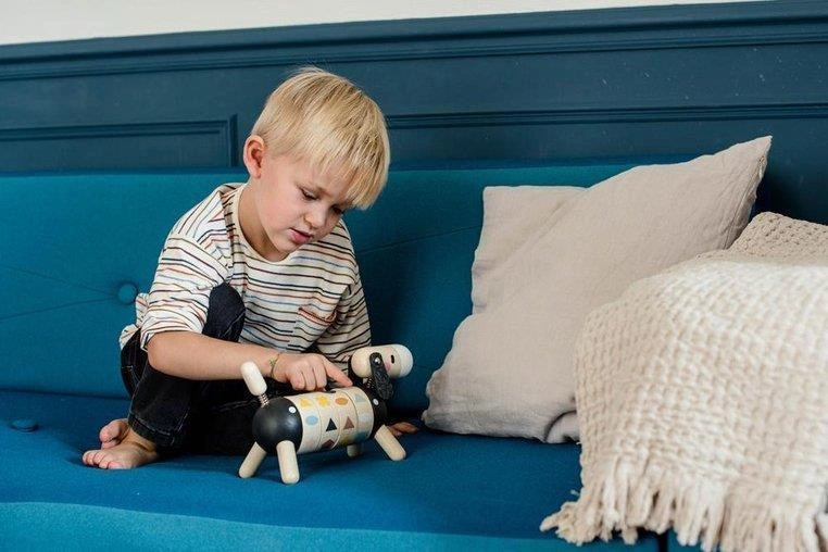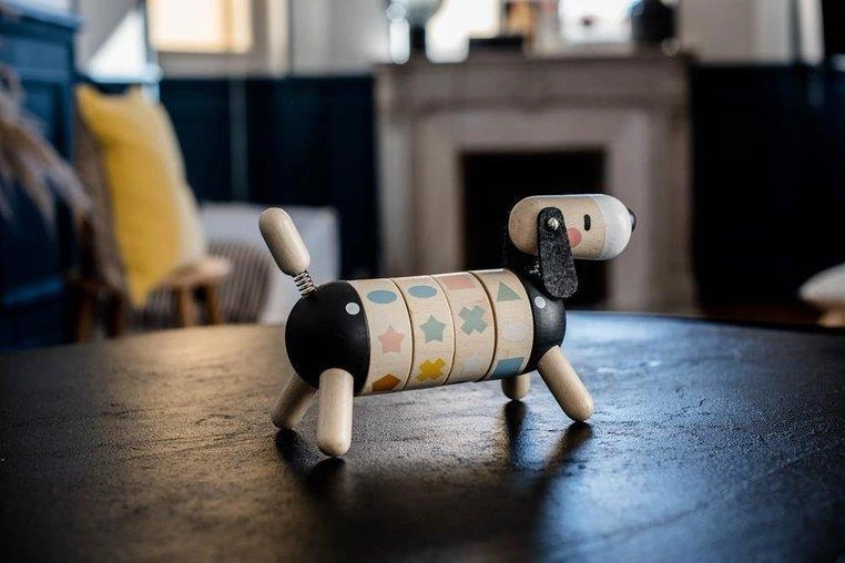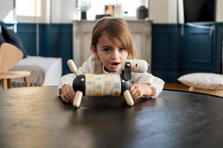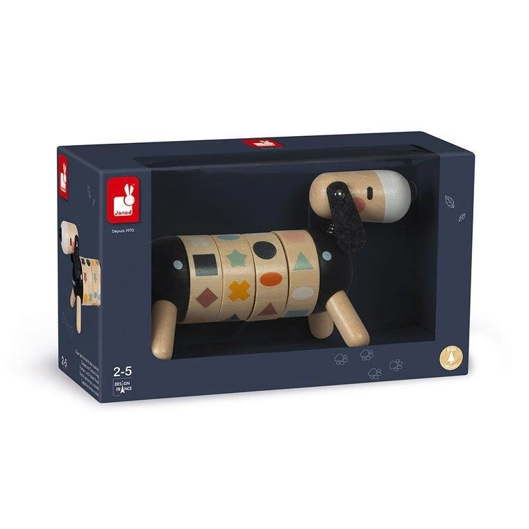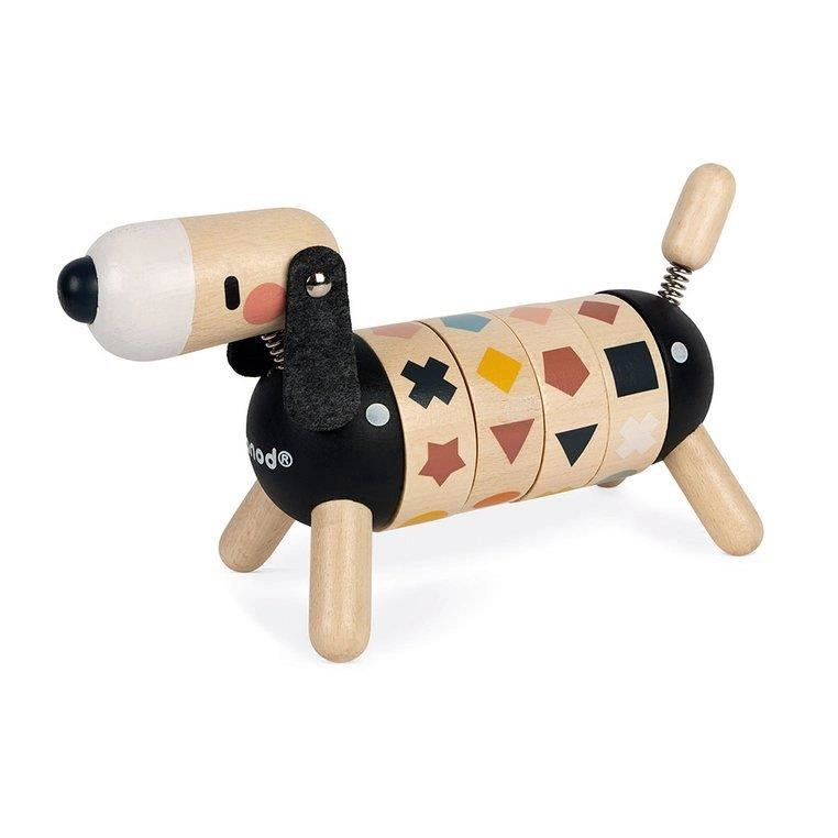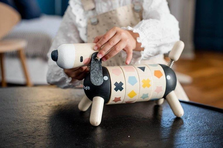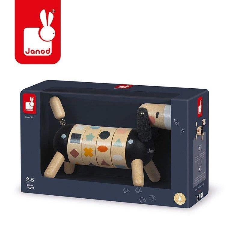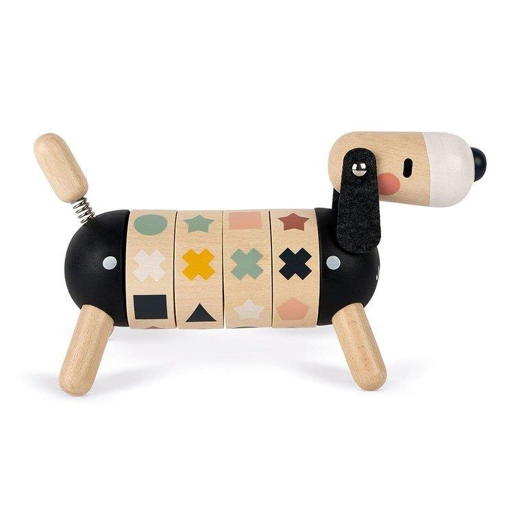 Drewniany sorter obrotowy Pies z serii Sweet Cocoon francuskiej marki JANOD rozwija u dziecka wiele kluczowych umiejętności, m.in. rozróżnianie i dopasowywanie kształtów i kolorów czy tzw. małą motorykę, a ponadto uczy koncentracji, spostrzegawczości i cierpliwości. Ma postać sporych rozmiarów jamnika z ogonkiem i główką na sprężynkach, czarnym noskiem i długimi filcowymi uszami. Tułów psa składa się z 4 obręczy z obrazkami, które należy odpowiednio skonfigurować, tj. ułożyć rząd 4 takich samych figur lub 4 figur w tym samym kolorze. Zabawka utrzymana jest w pięknych, jakby „dorosłych”, kolorach jasnego drewna i czerni z elementami w odcieniach m.in. pastelowego niebieskiego, zielonego, różu, brązu czy bieli.
