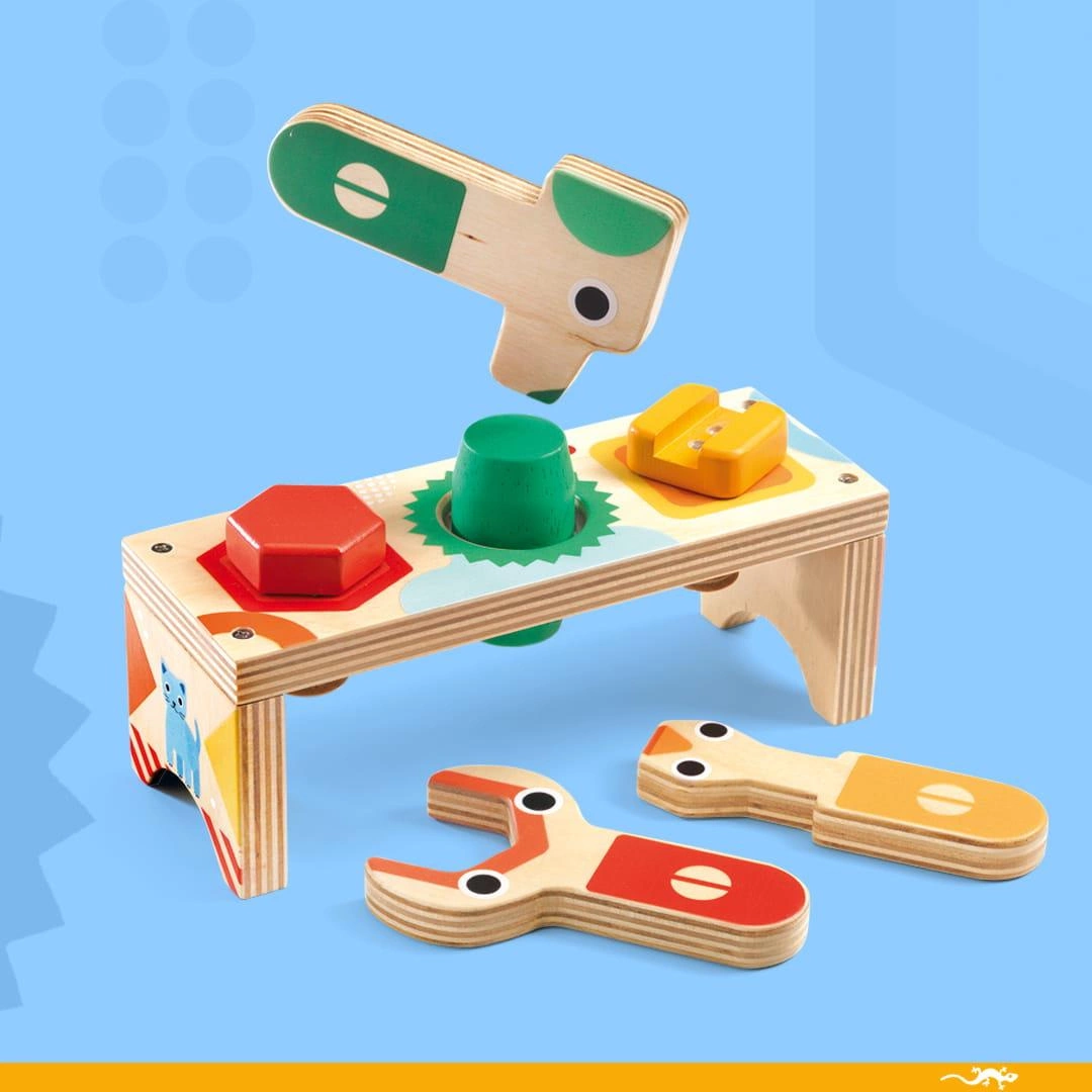 Dziecko będzie się dobrze bawić, układając kształty we właściwym kolorze, a następnie przy użyciu odpowiedniego narzędzia, dokręci lub przybije odpowiedni element. Dzięki oznaczeniom kolorami dziecko łatwo dopasuje elementy, będzie ćwiczyło sprawność dłoni, używając klucza, młotka i śrubokręta.
