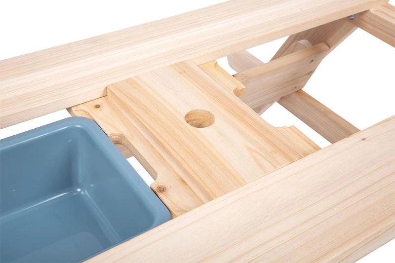 Zabawa piaskiem oferuje szeroką gamę bodźców dla zmysłów, w tym percepcję powierzchni skóry i poprawę umiejętności motorycznych. Aby wydłużyć żywotność produktu i chronić naturalne, nieobrobione drewno, stół można pokryć lakierem chroniącym drewno i pomalować zgodnie z życzeniem.