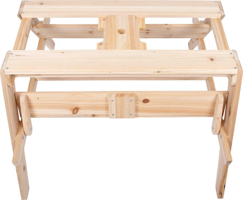 Drewniany stolik dla dzieci z siedzeniami i chowanymi przegródkami do zabawy piaskiem, wodą, błotem lub do przechowywania zabawek lub innych to propozycja renomowanego producenta zabawek marki Small Foot. Ten wysoce uniwersalny stół stworzony został z nieobrobionego, odpornego na warunki atmosferyczne, litego drewna najwyższej jakości. Jak już wspomniane zostało powyżej, nie jest to "zwykły" stolik z siedzeniami, gdyż oferuje dzieciom możliwość wielogodzinnej, kreatywnej zabawy na świeżym powietrzu. Główna atrakcja kryje się wewnątrz tego stolika: gdy tylko dwa blaty zostaną podniesione, staje się on doskonałym miejscem do zabawy piaskiem, wodą czy błotem. Stolik wyposażony został w dwie wyjmowane miski na błoto wykonane z wytrzymałego plastiku. w tych 3 litrowych pojemnikach można przechować także np. zabawki lub elementy zebrane z natury np. kamyczki czy szyszki. Możliwości wykorzystania tych pojemników są wręcz nieograniczone. Jest to sprytny, wielofunkcyjny zestaw do siedzenia dla dzieci, który może być również używany jako stół piknikowy lub stół do rysowania i tworzenia, a także jako stół błotny. Otwory na plastikowe pojemniki ułatwiają ich wyjmowanie, a parasol przeciwsłoneczny można umieścić w otworze pośrodku blatu, aby zapewnić trochę cienia. Stolik ten będzie prezentował się wyśmienicie w przydomowym ogrodzie, na tarasie lub na balkonie. Powierzchnie do siedzenia można złożyć, aby chronić je przed złymi warunkami pogodowymi, dzięki czemu dzieci mogą bawić się przy stole również na stojąco, a powierzchnia siedzenia nie przesiąknie deszczem.